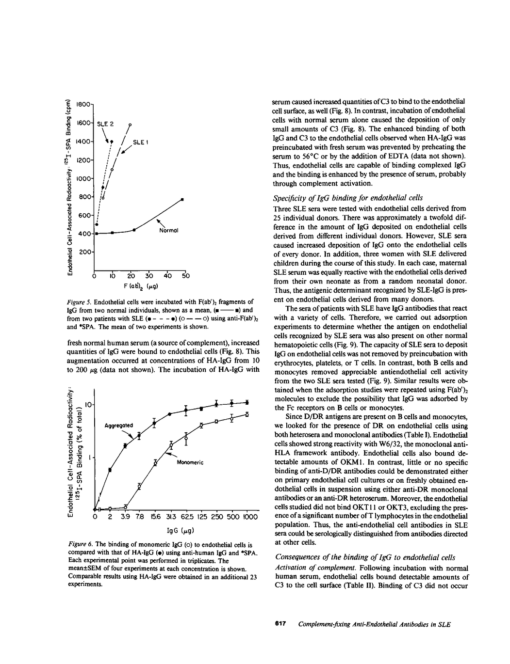 Vasculitis in systemic lupus erythematosus (SLE) is associated with the deposition of IgG and complement in blood vessel walls. However, it is not known whether immune injury to endothelial cells is a part of this process. Therefore, we used a solid phase radioimmunoassay to study the ability of IgG from normal human sera and sera from patients with SLE to bind to endothelial cells. In this assay, cultured human umbilical venous endothelial cells were sequentially incubated with normal or SLE sera, goat anti-human IgG, and 125I-labeled staphylococcal protein A (*SPA). After exposure to normal sera, 2.5 +/- 0.5% (mean +/- SD) of the added *SPA bound to the cells, whereas after exposure to SLE sera 13.8 +/- 7.6% of the added *SPA bound to these cells. This difference in binding was highly significant (P less than 0.001). Binding was partially reduced when SLE sera were preincubated with B-lymphocytes or monocytes, but not after exposure to erythrocytes, platelets, or T lymphocytes. Incubation of endothelial cells with the 7S fraction of SLE sera or with the F(ab')2 fragment of SLE-IgG resulted in the deposition of greater than 80% as much IgG as was deposited on endothelial cells by whole serum. However, since higher molecular weight fractions (greater than 7S) of SLE sera were also active, we tested the capacity of endothelial cells to bind IgG complexes. Endothelial cells bound heat-aggregated IgG (HA-IgG) in a saturable manner at one log concentration below the binding of normal monomeric IgG. Binding of HA-IgG to endothelial cells was markedly enhanced by preincubation with a serum source of complement. Both HA-IgG and SLE-IgG also bound to freshly obtained endothelial cells in suspension, as detected by automated fluorescence flow cytometry. Binding of SLE-IgG and HA-IgG to endothelium initiated complement activation, deposition of the third component of complement, and disruption of the monolayer. In addition, SLE-IgG and HA-IgG caused endothelial cells to secrete prostacyclin and caused the adherence of platelets, confirmed by scanning electron microscopy. These studies demonstrate that IgG anti-endothelial antibodies are present in the sera of patients with active SLE. These sera may also contain IgG complexes that are capable of binding to endothelial cells. The association of IgG and complement with endothelial cells may initiate vascular injury in SLE and other human disorders.
