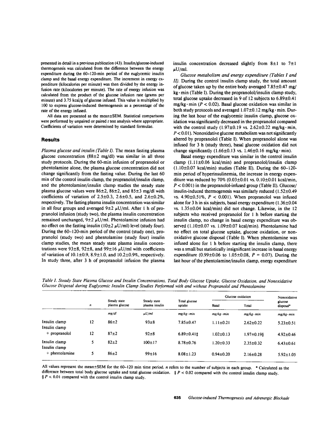 After intravenous glucose/insulin infusion there is an increase in oxygen consumption and energy expenditure that has been referred to as thermogenesis. To examine the contribution of the beta and alpha adrenergic nervous system to this thermogenic response, 12 healthy volunteers participated in three studies: (a) euglycemic insulin (plasma insulin approximately 100 microunits/ml) clamp study (n = 12); (b) insulin clamp study after beta adrenergic blockade with intravenous propranolol for 1 h (n = 12); (c) insulin clamp study after alpha adrenergic blockade with phentolamine for 1 h (n = 5). During the control insulin clamp study total glucose uptake, glucose oxidation and nonoxidative glucose uptake averaged 7.85 +/- 0.47, 2.62 +/- 0.22, and 5.23 +/- 0.51 mg/kg X min. After propranolol infusion, insulin-mediated glucose uptake was significantly reduced, 6.89 +/- 0.41 (P less than 0.02). This decrease was primarily the result of a decrease in glucose oxidation (1.97 +/- 0.19 mg/kg X min, P less than 0.01) without any change in nonoxidative glucose metabolism. Phentolamine administration had no effect on total glucose uptake, glucose oxidation, or nonoxidative glucose disposal. The increments in energy expenditure (0.10 +/- 0.01 vs. 0.03 +/- 0.01 kcal/min) and glucose/insulin-induced thermogenesis (4.9 +/- 0.5 vs. 1.5 +/- 0.5%) were reduced by 70% during the propranolol/insulin clamp study. The increments in energy expenditure (0.12 +/- 0.03 kcal/min) and thermogenesis (5.0 +/- 1.5%) were not affected by phentolamine. These results indicate that activation of the beta adrenergic receptor plays an important role in the insulin/glucose-mediated increase in energy expenditure and thermogenesis. In contrast, the alpha adrenergic receptor does not appear to participate in this response.