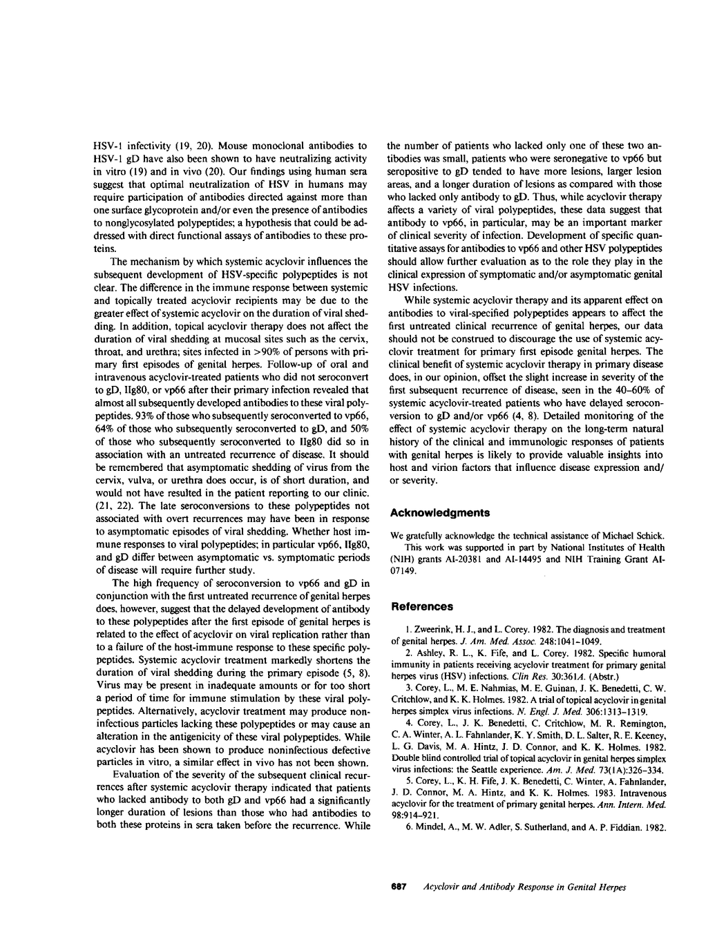 Sera from patients with first episode primary genital herpes infections who were treated with the antiviral drug acyclovir were studied to determine the effect of therapy on the immune response to herpes simplex virus (HSV) glycoproteins and polypeptides. 63 patients were evaluated, 35 patients received acyclovir: 11 intravenously, 12 orally, and 12 topically, while 28 received placebo. Topical application of acyclovir had no effect on the immune response to HSV infection. However, both oral and intravenous acyclovir were associated with later development of antibodies to two glycoproteins (of 80,000 and 60,000 mol wt [IIg80 and gD, respectively]) and one nonglycosylated polypeptide of 66,000 mol wt (vp66). Antibody to IIg80 was present in convalescent phase serum in 13/23 systemic acyclovir recipients vs. 18/19 placebo recipients (P = 0.01) and antibody to gD was detected in 8/23 oral or intravenous acyclovir recipients vs. 11/19 placebo recipients (P = 0.06). The mean time to seroconversion to IIg80 (39.0 d) and gD (55.5 d) was significantly longer for systemic acyclovir recipients than for the placebo controls, 23.4 and 18.5 d, respectively (P less than 0.05 for each comparison). 7 (30%) of 23 systemic acyclovir recipients compared with 100% of the placebo recipients had antibody to vp66 by 30 d after onset of the primary episode (P less than 0.001). Subsequent untreated recurrences of genital herpes were associated with seroconversion to gD, IIg80, and vp66. Patients who lacked antibody to both gD and vp66 in sera taken before their first clinical recurrence of disease experienced a longer duration of the recurrent episode (10.8 d) than those who possessed antibody to both vp66 and gD (6.3 d) (P less than 0.05). In addition, the mean duration of lesions, number of lesions, and mean lesion area were greater in patients who lacked antibody to vp66 but had anti gD, as compared with those who had anti-p66 but lacked anti-gD; suggesting that antibody to vp66 correlated more closely with subsequent disease severity than did antibody to gD. Acyclovir therapy appears to influence the frequency and time of development of antibody to a number of different HSV-specific polypeptides. Further studies of the effects of antiviral therapies on the immune response to these proteins may help clarify the role of these polypeptides in the pathogenesis of disease.