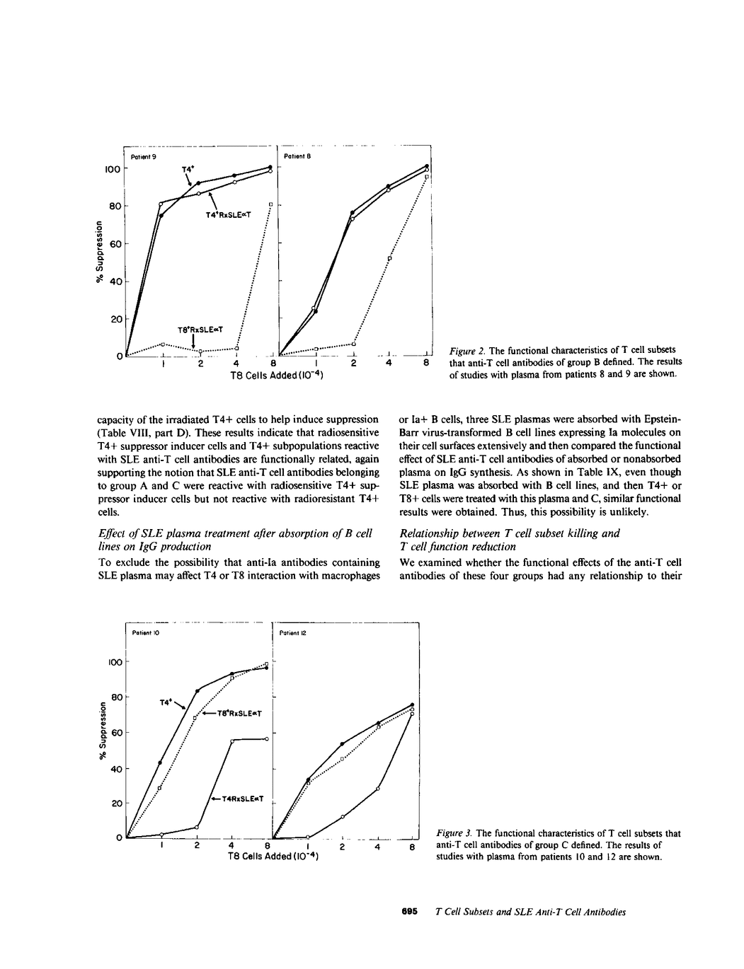 Previous studies have shown that patients with systemic lupus erythematosus (SLE) had differing T cell T4+/T8+ ratios and that the ratio correlated with clinical features of the disease. In the present study, we wished to determine whether the peripheral blood T cell subsets in these patients were related to the specificity of anti-T cell antibodies found in their plasma. Plasma from 24 SLE patients that reacted with greater than 20% of normal T cells were analyzed for their effect on in vitro pokeweed mitogen-stimulated immunoglobulin synthesis and for their reactivity with human T4+ and T8+ cells. Anti-T cell antibodies found in SLE patients have a spectrum of reactivities. We concentrated upon antibodies that interfere with suppressor function. One group of SLE anti-T cell antibodies reacts preferentially with the T8+ suppressor effector cell whereas another is reactive with T4+ suppressor inducer subsets. SLE patients with high T4+/T8+ ratios had anti-T cell antibodies predominantly reactive with the T8+ suppressor effector cells. Patients with low T4+/T8+ ratios, on the other hand, had anti-T cell antibodies reactive with either the T4+ suppressor inducer or with both the T4+ suppressor inducer and T8+ suppressor effector cells. In addition, a fourth group was defined whose anti-T cell antibodies were neither reactive with a functional T4+ suppressor inducer nor a functional T8+ suppressor effector cells. There was a significant correlation between the circulating T4+/T8+ ratio of peripheral T cells in these patients and the relative ability of their anti-T cell antibodies to kill T8+ cells vs. T4+ cells (gamma = 0.666, P less than 0.001). These results support the notion that in SLE different cellular defects in the immunoregulatory circuit underlie the development of autoimmune reactions and that the anti-T cell antibodies may cause numerical and functional deficiencies in T cell subsets.