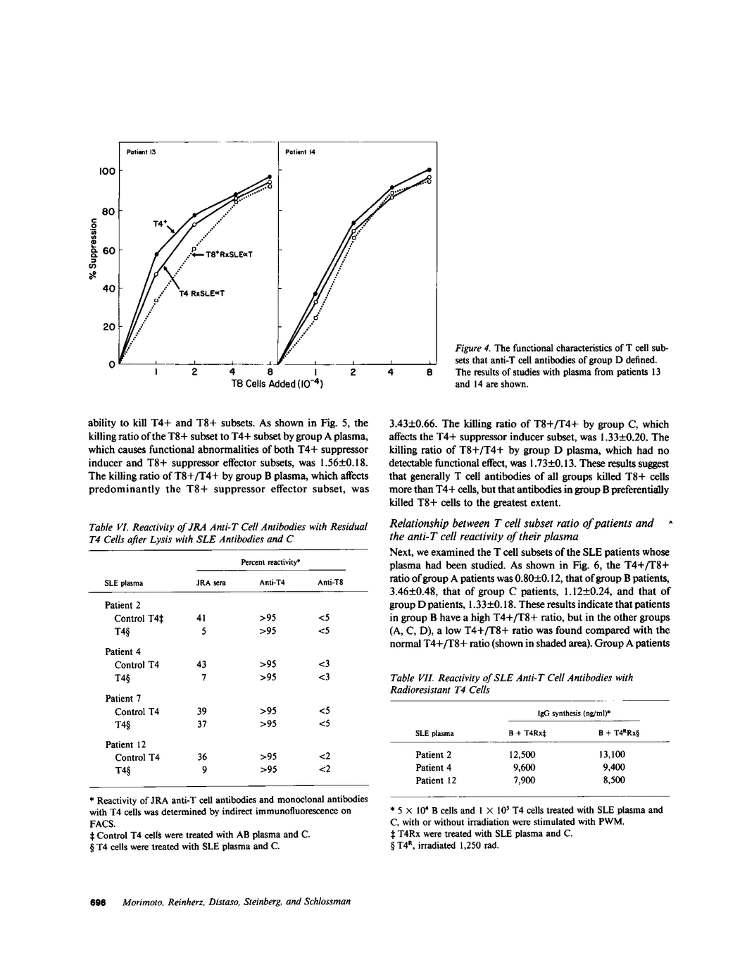 Previous studies have shown that patients with systemic lupus erythematosus (SLE) had differing T cell T4+/T8+ ratios and that the ratio correlated with clinical features of the disease. In the present study, we wished to determine whether the peripheral blood T cell subsets in these patients were related to the specificity of anti-T cell antibodies found in their plasma. Plasma from 24 SLE patients that reacted with greater than 20% of normal T cells were analyzed for their effect on in vitro pokeweed mitogen-stimulated immunoglobulin synthesis and for their reactivity with human T4+ and T8+ cells. Anti-T cell antibodies found in SLE patients have a spectrum of reactivities. We concentrated upon antibodies that interfere with suppressor function. One group of SLE anti-T cell antibodies reacts preferentially with the T8+ suppressor effector cell whereas another is reactive with T4+ suppressor inducer subsets. SLE patients with high T4+/T8+ ratios had anti-T cell antibodies predominantly reactive with the T8+ suppressor effector cells. Patients with low T4+/T8+ ratios, on the other hand, had anti-T cell antibodies reactive with either the T4+ suppressor inducer or with both the T4+ suppressor inducer and T8+ suppressor effector cells. In addition, a fourth group was defined whose anti-T cell antibodies were neither reactive with a functional T4+ suppressor inducer nor a functional T8+ suppressor effector cells. There was a significant correlation between the circulating T4+/T8+ ratio of peripheral T cells in these patients and the relative ability of their anti-T cell antibodies to kill T8+ cells vs. T4+ cells (gamma = 0.666, P less than 0.001). These results support the notion that in SLE different cellular defects in the immunoregulatory circuit underlie the development of autoimmune reactions and that the anti-T cell antibodies may cause numerical and functional deficiencies in T cell subsets.