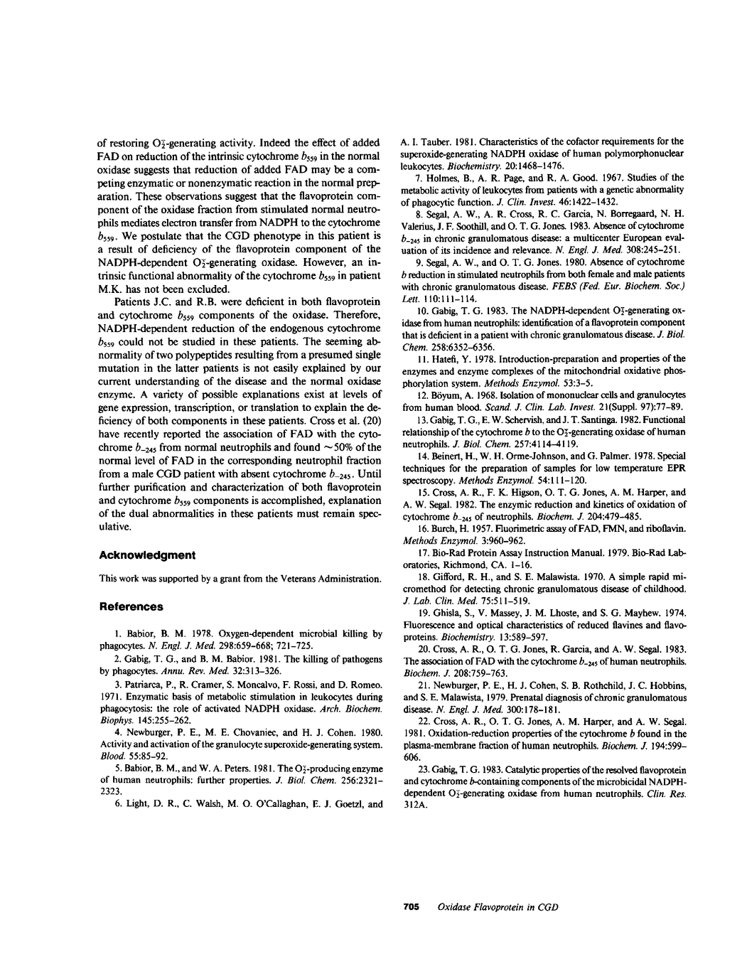 The NADPH-dependent O2-.-generating oxidase in subcellular fractions from the neutrophils of three male patients with chronic granulomatous disease was compared with the corresponding preparations from normal neutrophils. The oxidase from normal neutrophils contained flavin adenine dinucleotide in an approximately 0.9:1 molar ratio with cytochrome b559. Each of the three chronic granulomatous disease patients had decreased amounts of the flavoprotein component of the oxidase fraction. The oxidase from two chronic granulomatous disease patients had undetectable amounts of cytochrome b559 whereas the third patient had a normal content of cytochrome b559, which was spectrally indistinguishable from the normal. The intrinsic cytochrome b559 in the oxidase fraction from stimulated neutrophils of the latter chronic granulomatous disease patient was not reduced by NADPH under anaerobic conditions, in distinction with the previously reported reduction of the normal cytochrome b559 under identical conditions. We conclude that the flavoprotein component of the oxidase may mediate transfer of electrons from NADPH to the cytochrome b559 in normal neutrophils, and that deficiency of this flavoprotein is associated with the chronic granulomatous disease phenotype in the three patients studied.