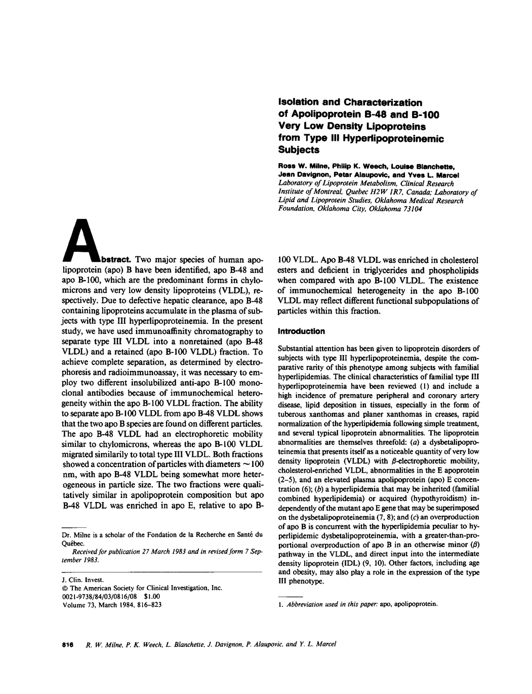 R W Milne, P K Weech, L Blanchette, J Davignon, P Alaupovic, Y L Marcel