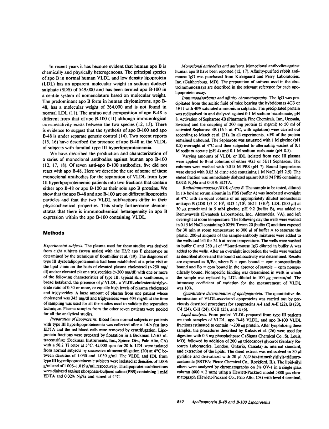 Two major species of human apolipoprotein (apo) B have been identified, apo B-48 and apo B-100, which are the predominant forms in chylomicrons and very low density lipoproteins (VLDL), respectively. Due to defective hepatic clearance, apo B-48 containing lipoproteins accumulate in the plasma of subjects with type III hyperlipoproteinemia. In the present study, we have used immunoaffinity chromatography to separate type III VLDL into a nonretained (apo B-48 VLDL) and a retained (apo B-100 VLDL) fraction. To achieve complete separation, as determined by electrophoresis and radioimmunoassay, it was necessary to employ two different insolubilized anti-apo B-100 monoclonal antibodies because of immunochemical heterogeneity within the apo B-100 VLDL fraction. The ability to separate apo B-100 VLDL from apo B-48 VLDL shows that the two apo B species are found on different particles. The apo B-48 VLDL had an electrophoretic mobility similar to chylomicrons, whereas the apo B-100 VLDL migrated similarly to total type III VLDL. Both fractions showed a concentration of particles with diameters approximately 100 nm, with apo B-48 VLDL being somewhat more heterogeneous in particle size. The two fractions were qualitatively similar in apolipoprotein composition but apo B-48 VLDL was enriched in apo E, relative to apo B-100 VLDL. Apo B-48 VLDL was enriched in cholesterol esters and deficient in triglycerides and phospholipids when compared with apo B-100 VLDL. The existence of immunochemical heterogeneity in the apo B-100 VLDL may reflect different functional subpopulations of particles within this fraction.