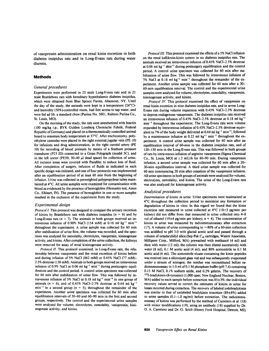 To study the relationship between vasopressin and the renal kallikrein-kinin system we measured the rate of excretion of kinins into the urine of anesthetized rats during conditions of increased and decreased vasopressin level. The excretion of immunoreactive kinins in Brattleboro rats with hereditary diabetes insipidus (DI) (24 +/- 3 pg min-1 kg-1) was lower than in the control Long Evans (LE) rats (182 +/- 22 pg min-1 kg-1; P less than 0.05). The DI rats also exhibited negligible urinary excretion of immunoreactive vasopressin, reduced urine osmolality, and increased urine flow and kininogenase excretion. In LE rats, volume expansion by infusion of 0.45% NaCl-2.5% dextrose to lower vasopressin secretion reduced (P less than 0.05) kinin excretion, vasopressin excretion, and urine osmolality to 41, 26, and 15% of their respective control values, while increasing (P less than 0.05) urine flow and kininogenase excretion. On the other hand, the infusion of 5% NaCl, which promotes vasopressin secretion, increased (P less than 0.05) the urinary excretion of kinins and vasopressin to 165 and 396% of control, while increasing (P less than 0.05) urine flow and kininogenase excretion. Infusion of vasopressin (1.2 mU/h, intravenous) enhanced (P less than 0.05) kinin excretion by two to threefold in DI rats and in LE rats during volume expansion with 0.45% NaCl-2.5% dextrose, while decreasing urine flow and increasing urine osmolality. This study demonstrates that the urinary excretion of immunoreactive kinins varies in relation to the urinary level of vasopressin, irrespective of urine volume and osmolality and of the urinary excretions of sodium and kininogenase. The study suggests a role for vasopressin in promoting the activity of the renal kallikrein-kinin system in the rat.