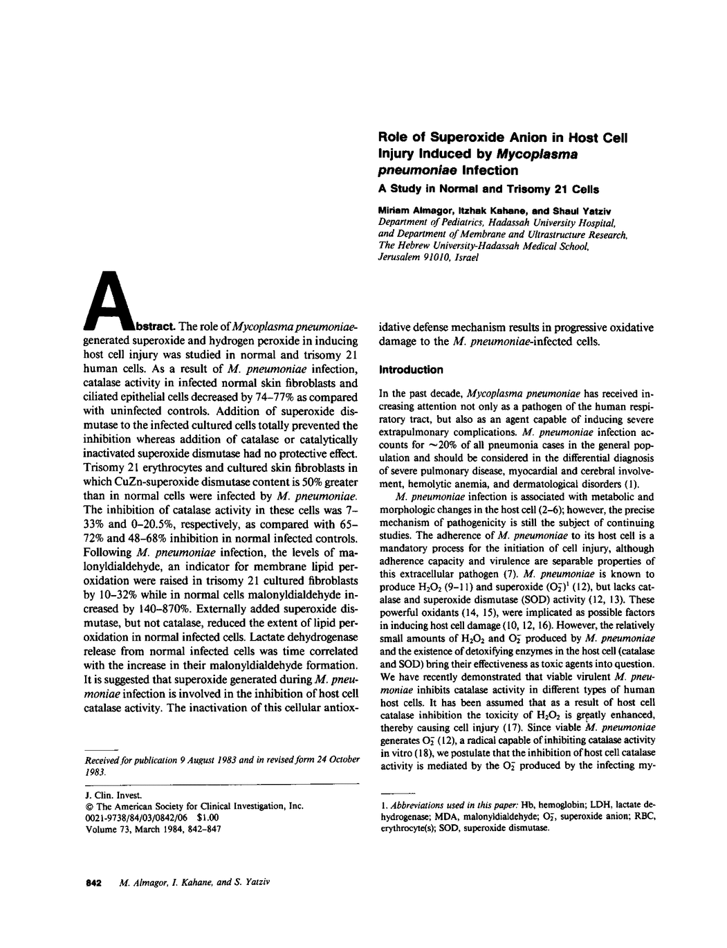 The role of Mycoplasma pneumoniae-generated superoxide and hydrogen peroxide in inducing host cell injury was studied in normal and trisomy 21 human cells. As a result of M. pneumoniae infection, catalase activity in infected normal skin fibroblasts and ciliated epithelial cells decreased by 74-77% as compared with uninfected controls. Addition of superoxide dismutase to the infected cultured cells totally prevented the inhibition whereas addition of catalase or catalytically inactivated superoxide dismutase had no protective effect. Trisomy 21 erythrocytes and cultured skin fibroblasts in which CuZn-superoxide dismutase content is 50% greater than in normal cells were infected by M. pneumoniae. The inhibition of catalase activity in these cells was 7-33% and 0-20.5%, respectively, as compared with 65-72% and 48-68% inhibition in normal infected controls. Following M. pneumoniae infection, the levels of malonyldialdehyde, an indicator for membrane lipid peroxidation were raised in trisomy 21 cultured fibroblasts by 10-32% while in normal cells malonyldialdehyde increased by 140-870%. Externally added superoxide dismutase, but not catalase, reduced the extent of lipid peroxidation in normal infected cells. Lactate dehydrogenase release from normal infected cells was time correlated with the increase in their malonyldialdehyde formation. It is suggested that superoxide generated during M. pneumoniae infection is involved in the inhibition of host cell catalase activity. The inactivation of this cellular antioxidative defense mechanism results in progressive oxidative damage to the M. pneumoniae-infected cells.