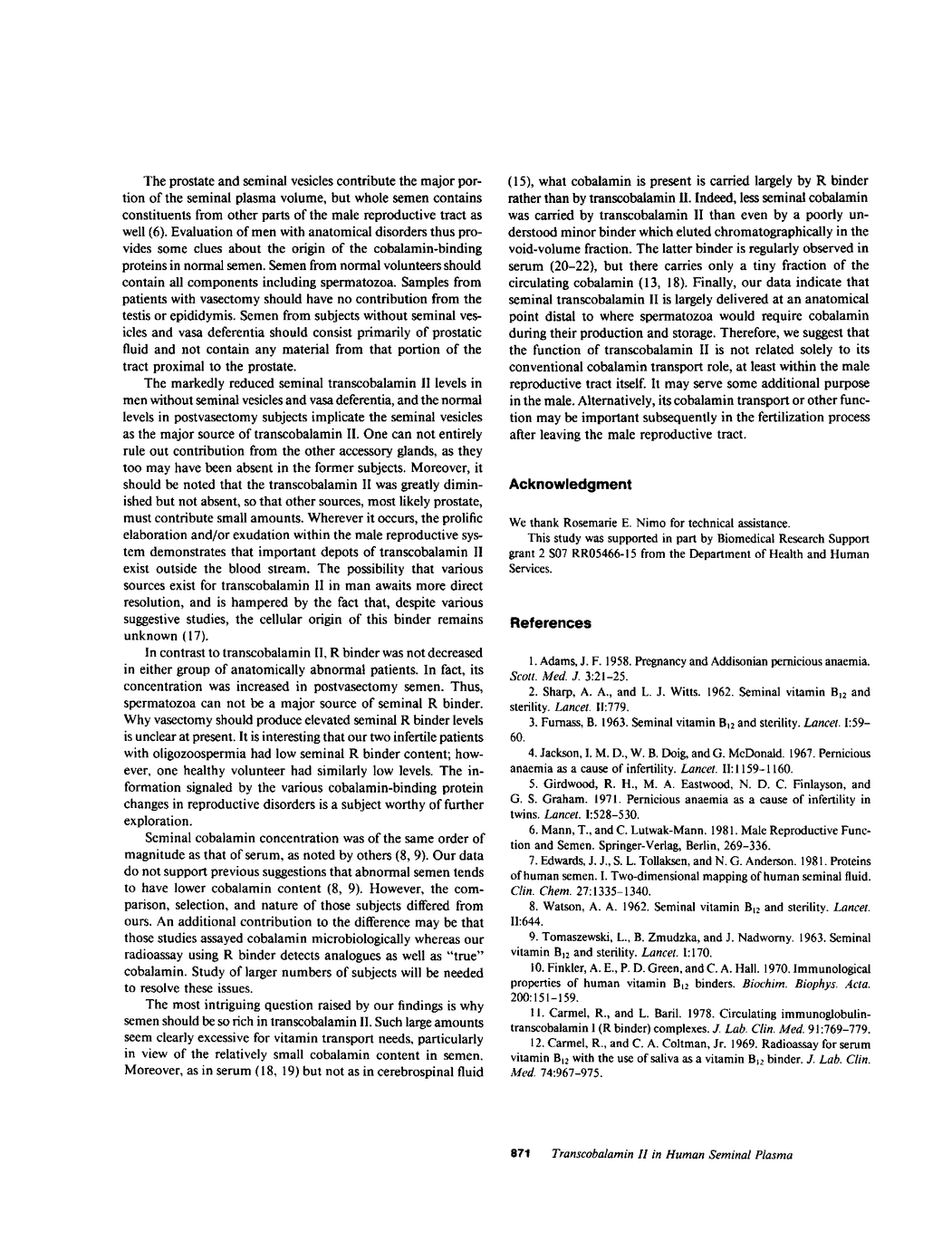 Study of cobalamin-binding proteins revealed seminal plasma to be the most concentrated site of transcobalamin II in man. The next richest normal fluid, blood, has approximately one-tenth its concentration. Normal seminal unsaturated cobalamin-binding capacity averaged 15,030 +/- 7,290 pg/ml, of which 11,550 +/- 6,660 pg/ml was transcobalamin II. Transcobalamin II levels were markedly diminished in subjects lacking seminal vesicles (1520-1660 pg/ml), but not after vasectomy. This suggests that seminal vesicles are the chief source of this protein in semen. R binder concentration was increased in postvasectomy subjects (9,970 +/- 4,900 pg/ml vs. 2,980 +/- 1,370 pg/ml in normals) and varied in other patients. The endogenous cobalamin content of semen was only 88-699 pg/ml, and was carried largely by R binder rather than by transcobalamin II. The function of the unusually large seminal transcobalamin II pool in reproduction is unknown, but seems unlikely to be related solely to cobalamin transport needs, at least within the male reproductive tract itself.