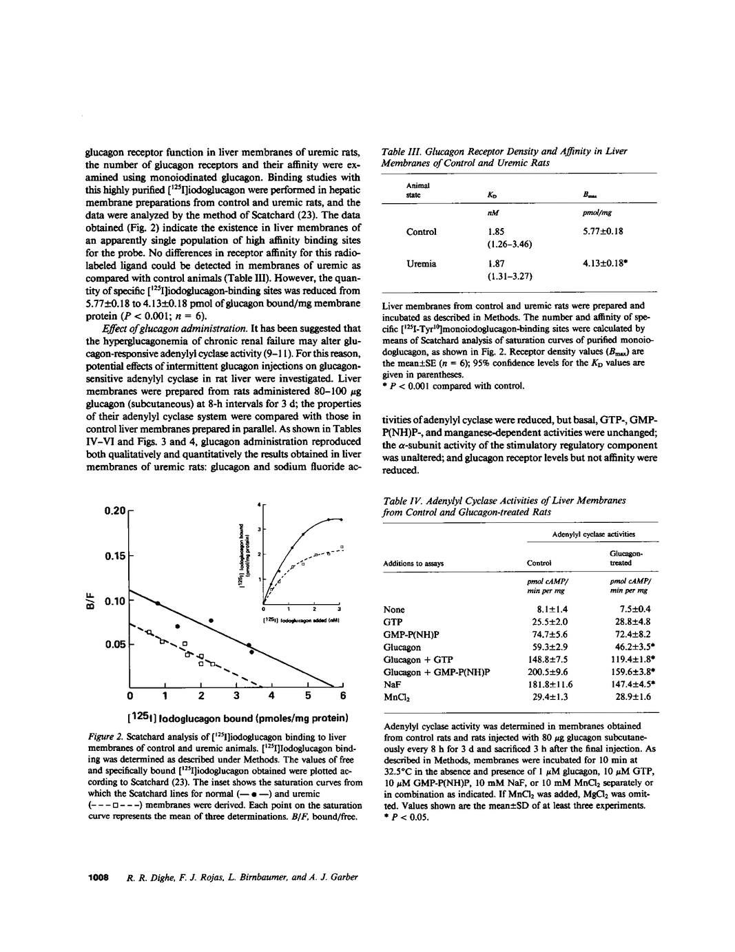 The effects of chronic uremia and glucagon administration on glucagon-stimulable adenylyl cyclase in rat liver were assessed by determinations of adenylyl cyclase activities, specific iodoglucagon binding, and the activity of the stimulatory regulatory component of adenylyl cyclase. Glucagon-stimulated adenylyl cyclase was reduced in uremia to 75-80% of control levels (P less than 0.05), in the presence or absence of saturating levels of guanosine triphosphate (GTP) and 5'-guanylylimidodiphosphate [GMP-P(NH)P]. Although these changes were accompanied by a concomitant 20% reduction in sodium fluoride-stimulated activity, basal, GTP-, GMP-P(NH)P-, and manganese-dependent adenylyl cyclase activities were unchanged. Using [125I-Tyr10]monoiodoglucagon as a receptor probe, the number of high affinity glucagon-binding sites was reduced 28% (P less than 0.01) in uremic as compared with control liver membranes. However, the affinity of these binding sites was unaltered. The S49 cyc- -reconstituting activity with respect to both GMP-P(NH)P- and isoproterenol plus GTP-stimulable adenylyl cyclase was unaltered in membranes from uremic as compared with control rats. Intermittent glucagon (80-100 micrograms) injections administered at 8-h intervals to normal rats reproduced all of the above described effects of chronic experimental uremia on the adenylyl cyclase system. It is concluded that changes in the hormone-stimulable adenylyl cyclase complex in uremia and with glucagon treatment result primarily from a decrease in the number of hormone-specific receptor sites in hepatic plasma membranes. Since the changes in liver adenylyl cyclase are qualitatively and quantitatively the same in glucagon-treated and uremic rats, it is suggested that these may be the result of the hyperglucagonemia of uremia. Further, the data reveal an unexpected dissociation between guanine nucleotide and sodium fluoride stimulation of adenylyl cyclase. Possible causes for this dissociation based on the known subunit composition of cyclase coupling proteins are discussed.
