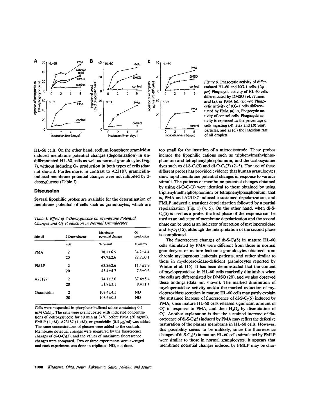 The alterations of stimulus-induced membrane potential changes, superoxide (O2-)-producing capacity and phagocytic activity during differentiation of human granulocytes were investigated in the human leukemia cell lines HL-60 and KG-1 differentiating in vitro and in human leukemic granulocytes obtained from chronic myelogenous leukemia patients. HL-60 cells incubated with dimethyl sulfoxide or with retinoic acid showed progressively increasing O2- production as well as membrane potential changes (depolarization) on contact with phorbol myristate acetate or the chemotactic peptide N-formyl-methionyl-leucyl-phenylalanine, with a concomitant increase in the proportion of mature cells of the granulocytic type. Phagocytosis of latex particles, yeast, and oil droplets appeared 24 h after incubation with dimethyl sulfoxide and anteceded the increment of O2- production and membrane potential changes, both of which appeared concomitantly 3 d after incubation with dimethyl sulfoxide. Similar findings were observed when immature and mature granulocytes obtained from chronic myelogenous leukemia patients were stimulated by phorbol ester, the chemotactic peptide, or calcium ionophore A23187, and the amount of O2- production was parallel to the magnitude of membrane potential changes. HL-60 and KG-1 cells incubated for 1-6 d with phorbol myristate acetate showed neither O2- production nor membrane potential changes on contact with phorbol ester, chemotactic peptide, or A23187, although such cells resembled macrophages morphologically, and their phagocytic activity was significantly increased. O2- production and membrane potential changes in normal granulocytes induced by phorbol ester, chemotactic peptide and A23187 were inhibited by 2-deoxyglucose. These findings indicate that the O2--producing system and the system provoking membrane potential changes may develop concomitantly as human granulocytes mature and differentiate, and that the development of these systems and of phagocytic activity may be independently regulated.