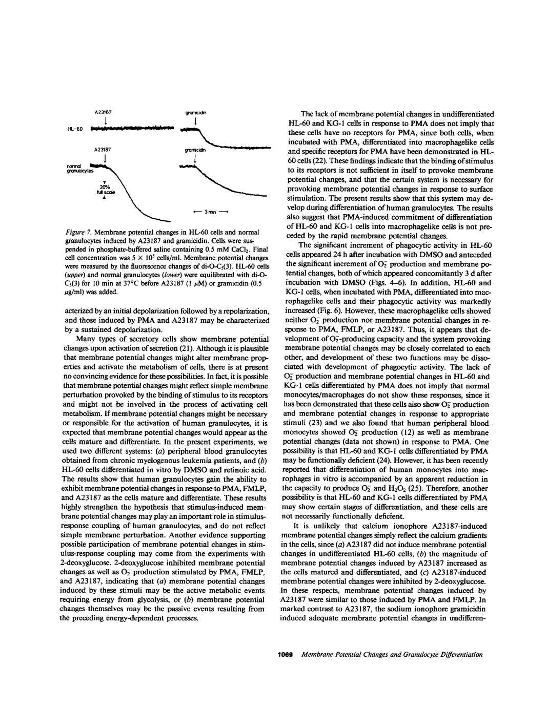 The alterations of stimulus-induced membrane potential changes, superoxide (O2-)-producing capacity and phagocytic activity during differentiation of human granulocytes were investigated in the human leukemia cell lines HL-60 and KG-1 differentiating in vitro and in human leukemic granulocytes obtained from chronic myelogenous leukemia patients. HL-60 cells incubated with dimethyl sulfoxide or with retinoic acid showed progressively increasing O2- production as well as membrane potential changes (depolarization) on contact with phorbol myristate acetate or the chemotactic peptide N-formyl-methionyl-leucyl-phenylalanine, with a concomitant increase in the proportion of mature cells of the granulocytic type. Phagocytosis of latex particles, yeast, and oil droplets appeared 24 h after incubation with dimethyl sulfoxide and anteceded the increment of O2- production and membrane potential changes, both of which appeared concomitantly 3 d after incubation with dimethyl sulfoxide. Similar findings were observed when immature and mature granulocytes obtained from chronic myelogenous leukemia patients were stimulated by phorbol ester, the chemotactic peptide, or calcium ionophore A23187, and the amount of O2- production was parallel to the magnitude of membrane potential changes. HL-60 and KG-1 cells incubated for 1-6 d with phorbol myristate acetate showed neither O2- production nor membrane potential changes on contact with phorbol ester, chemotactic peptide, or A23187, although such cells resembled macrophages morphologically, and their phagocytic activity was significantly increased. O2- production and membrane potential changes in normal granulocytes induced by phorbol ester, chemotactic peptide and A23187 were inhibited by 2-deoxyglucose. These findings indicate that the O2--producing system and the system provoking membrane potential changes may develop concomitantly as human granulocytes mature and differentiate, and that the development of these systems and of phagocytic activity may be independently regulated.