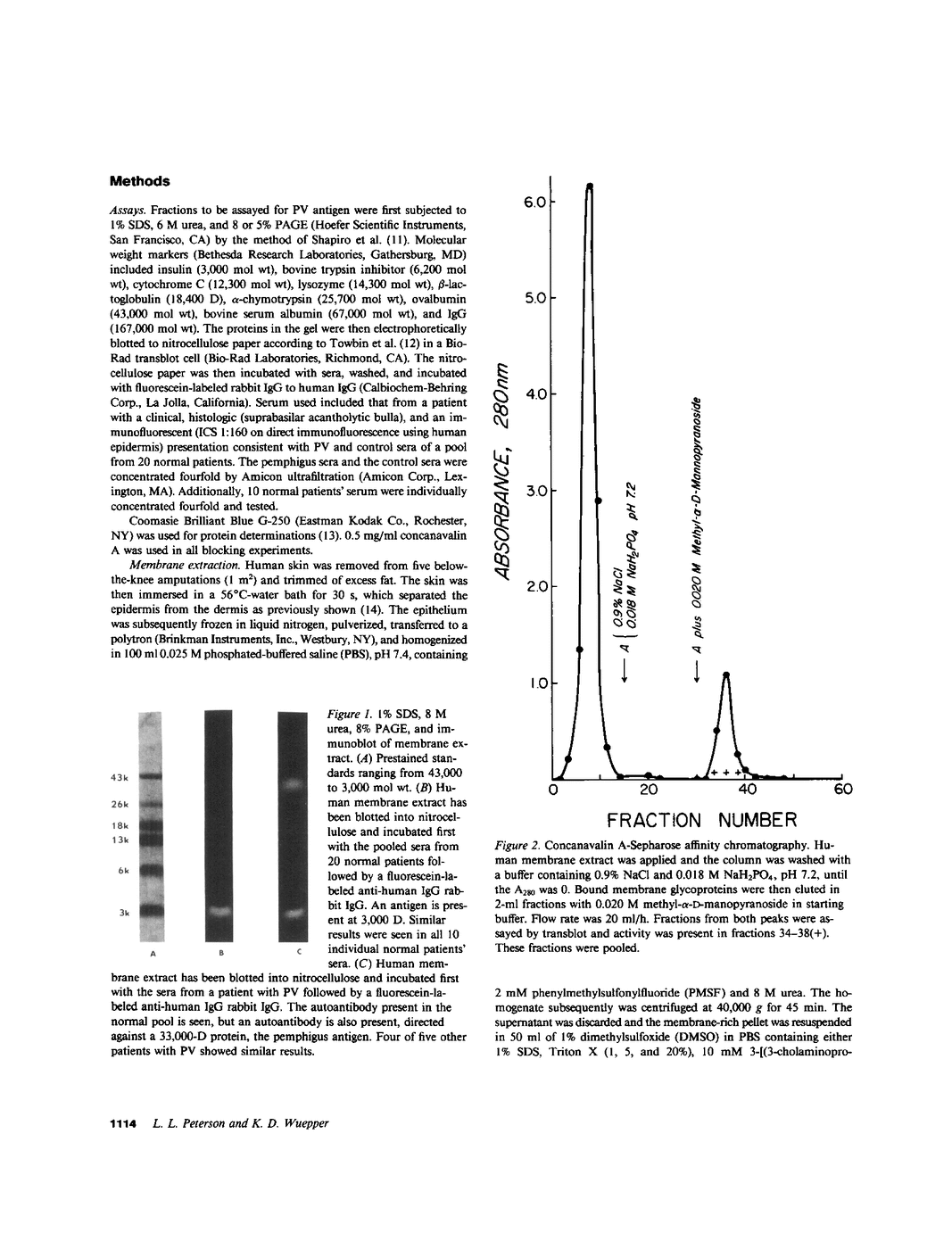 Pemphigus vulgaris is an autoimmune disease associated with an autoantibody directed against a keratinocyte membrane antigen. The purpose of this study was to purify the human pemphigus vulgaris antigen, to produce an antibody to this antigen, and to use the antibody to induce pemphigus in newborn mice. Various techniques to extract the membrane-rich pellet from human epidermal homogenate were compared; 1% sodium dodecyl sulfate (SDS) and 1% dimethylsulfoxide proved to be superior to extract the pemphigus vulgaris antigen. This antigen was identified by transfer blotting to nitrocellulose paper, incubated with pemphigus vulgaris serum, or 20 control sera, and detected with fluorescein labeled antisera to human IgG. Since concanavalin A inhibits the binding of pemphigus vulgaris antibody to tissue sections, we studied the binding of the extracted proteins to concanavalin A covalently coupled to Sepharose. Pemphigus vulgaris antigen bound to the concanavalin A column and was released by 0.02 M methyl alpha-D-mannopyranoside. The proteins thus recovered were subjected to AcA 54 gel permeation chromatography, and the pemphigus antigen was detected by the transfer blot assay. The antigen corresponded to a discrete peak at 66,000 D by gel permeation and gave one homogeneous band at 33,000 D in urea-SDS-polyacrylamide gel electrophoresis. Monospecific antibody to the antigen raised in rabbits stained human epidermis in the same manner as the pemphigus vulgaris autoantibody and induced pemphigus vulgaris in newborn mice when injected intraperitoneally. A pemphigus vulgaris antigen has been purified from adult human epidermis. It is a 66,000-D membrane glycoprotein that is composed of two apparently identical subunits of 33,000 D each.