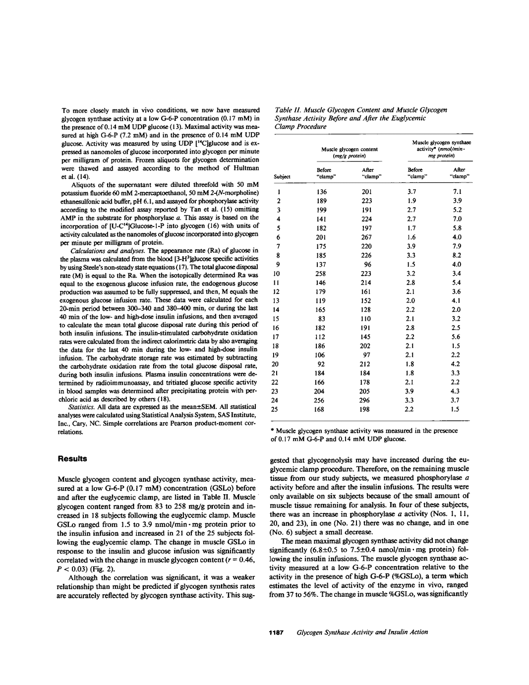 We have studied the relationship between in vivo insulin-mediated glucose disposal rates, muscle glycogen content, and muscle glycogen synthase activity in 25 southwest American Indians with normal glucose tolerance and with varying degrees of glucose intolerance. Insulin-mediated glucose disposal (M) was measured by using the hyperinsulinemic euglycemic clamp technique at plasma insulin concentrations of 134 +/- 7 and 1709 +/- 72 microU/ml, with simultaneous indirect calorimetry to assess glucose oxidation and storage rates. Muscle glycogen content and glycogen synthase activity were measured in percutaneous muscle biopsy samples obtained from the vastus lateralis muscle before and after the euglycemic clamp procedure. The results showed that muscle glycogen synthase activity at the end of the euglycemic clamp was well correlated with insulin-mediated glucose storage rates at both low (r = 0.50, P less than 0.02) and high (r = 0.78, P less than 0.0001) insulin concentrations; and also correlated with M (r = 0.66, P less than 0.001 and r = 0.76, P less than 0.0001). Similar correlations were observed between the change in muscle glycogen synthase activity and glucose storage rates and M. The change in muscle glycogen synthase activity correlated with the change in muscle glycogen content (r = 0.46, P less than 0.03) measured before and after the insulin infusions. The change in muscle glycogen content did not correlate with glucose storage rates or M. The data suggest the possible importance of glycogen synthesis in muscle in determining in vivo insulin-mediated glucose disposal rates in man.