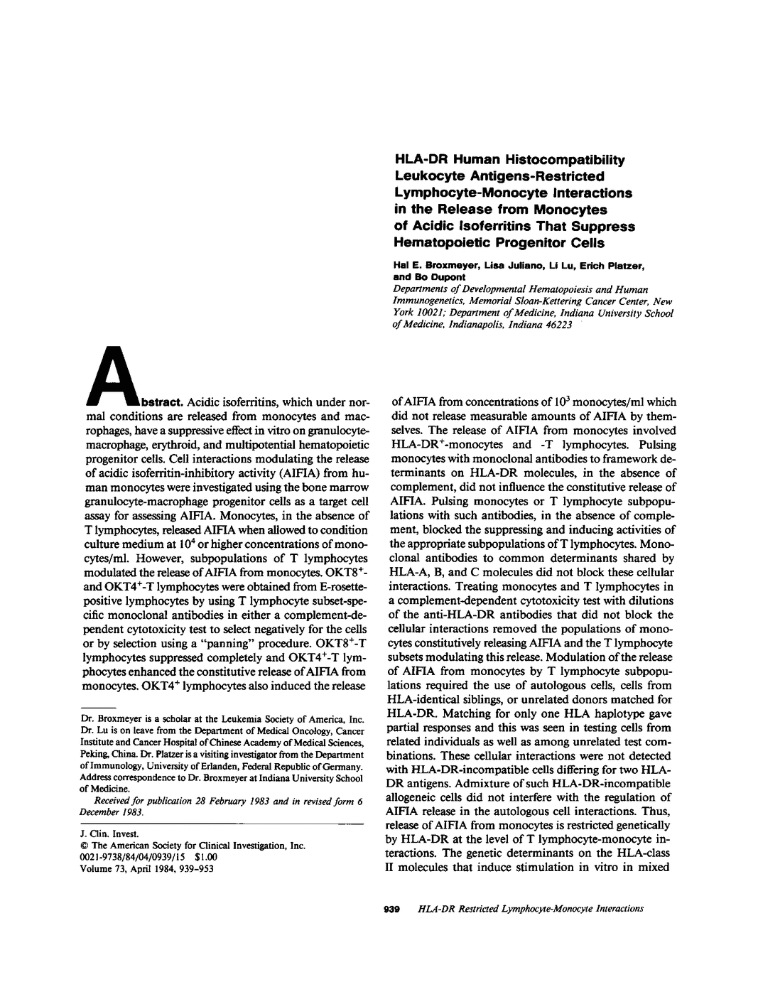 H E Broxmeyer, L Juliano, L Lu, E Platzer, B Dupont