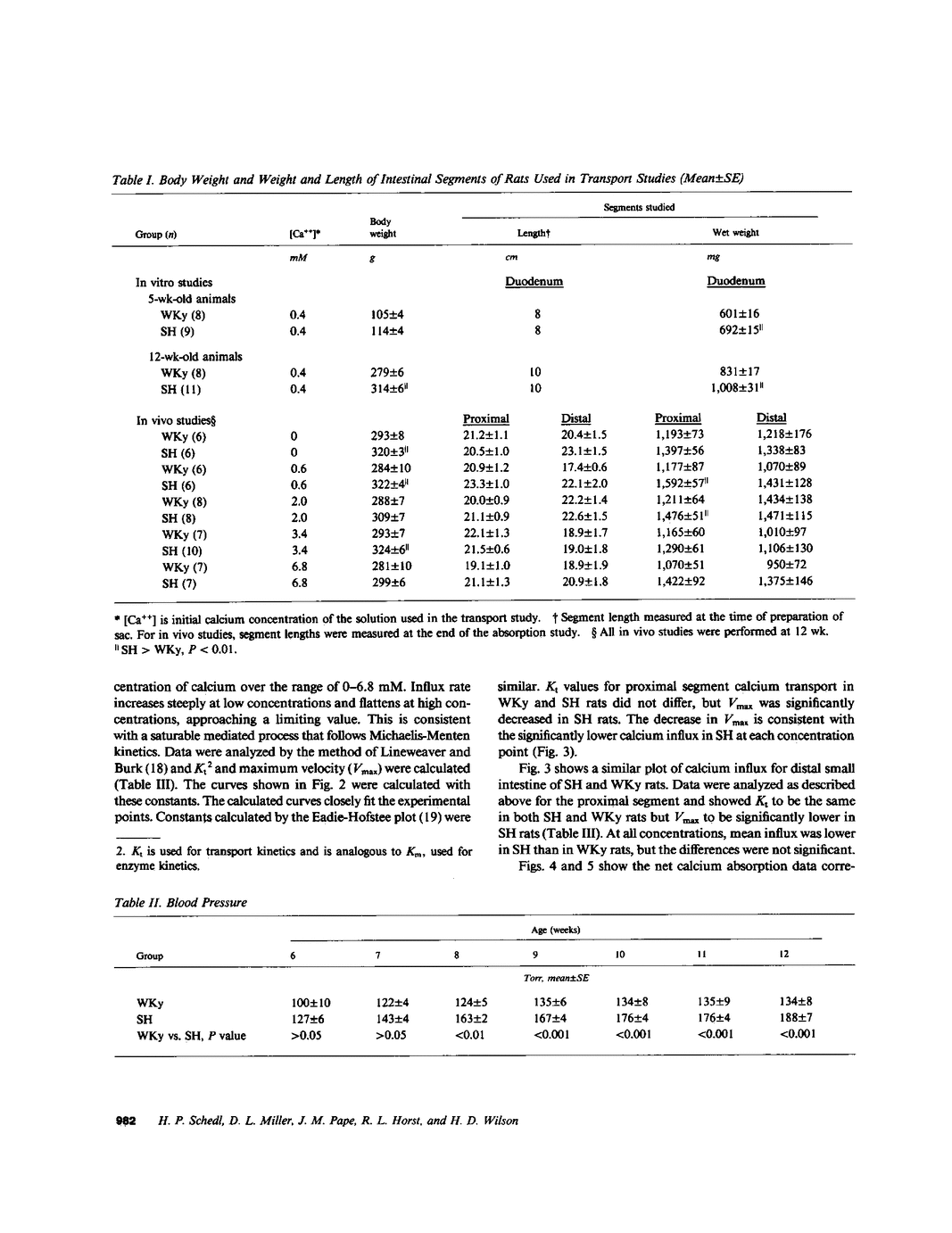 Serum ionized calcium levels are lower and immunoreactive parathyroid hormone levels are higher in the spontaneously hypertensive (SH) rat than in the normotensive Wistar-Kyoto (WKy) control. We postulated that there is either a defect in the regulation of vitamin D metabolism by parathyroid hormone or that the gut target organ for vitamin D in the SH rat is unresponsive. To test these hypotheses we measured serum concentrations of vitamin D metabolites and intestinal transport of calcium and sodium. Compared with that of WKy controls, in vitro calcium transport by duodenal sacs of the SH rat was decreased (P less than 0.001) at 5 wk, before the development of hypertension, and at 12 wk, after hypertension was well established. When measured in vivo in the most proximal 20 cm of small intestine, maximum velocity (Vmax) for calcium transport was decreased (P less than 0.05) and net absorption of sodium and water was increased (P less than 0.05) in SH rats as compared with WKy rats. Vmax for calcium transport was also decreased (P less than 0.05) in the most distal 20 cm of small intestine of SH rats, but net sodium and water transport were the same in SH and WKy rats. At 12 wk, serum concentration of 1,25-dihydroxycholecalciferol [1,25-(OH)2D3] was the same in both SH and WKy groups, but its precursor, 25-hydroxycholecalciferol, was increased (P less than 0.05) in the SH rat. We conclude that in the SH rat: (a) the concentration of 1,25-(OH)2D3 is inappropriately low in relation to the elevated immunoreactive parathyroid hormone and the depressed calcium absorption, suggesting a defect in the regulation of vitamin D metabolism; and (b) the depressed calcium absorption, in the setting of normal concentrations of [1,25-(OH)2D3], demonstrates unresponsiveness of the gut to vitamin D and may explain in part the low serum ionized calcium found in earlier studies. The presence of these abnormalities before we found a significant difference in blood pressure suggests that they may be causal, not secondary, to the hypertension.