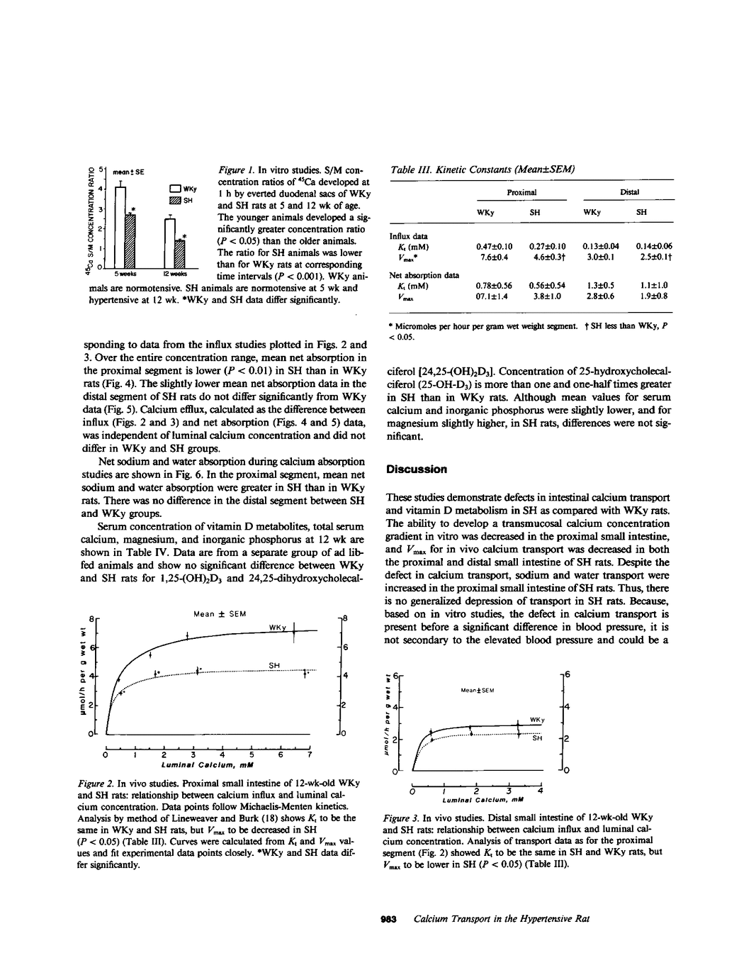 Serum ionized calcium levels are lower and immunoreactive parathyroid hormone levels are higher in the spontaneously hypertensive (SH) rat than in the normotensive Wistar-Kyoto (WKy) control. We postulated that there is either a defect in the regulation of vitamin D metabolism by parathyroid hormone or that the gut target organ for vitamin D in the SH rat is unresponsive. To test these hypotheses we measured serum concentrations of vitamin D metabolites and intestinal transport of calcium and sodium. Compared with that of WKy controls, in vitro calcium transport by duodenal sacs of the SH rat was decreased (P less than 0.001) at 5 wk, before the development of hypertension, and at 12 wk, after hypertension was well established. When measured in vivo in the most proximal 20 cm of small intestine, maximum velocity (Vmax) for calcium transport was decreased (P less than 0.05) and net absorption of sodium and water was increased (P less than 0.05) in SH rats as compared with WKy rats. Vmax for calcium transport was also decreased (P less than 0.05) in the most distal 20 cm of small intestine of SH rats, but net sodium and water transport were the same in SH and WKy rats. At 12 wk, serum concentration of 1,25-dihydroxycholecalciferol [1,25-(OH)2D3] was the same in both SH and WKy groups, but its precursor, 25-hydroxycholecalciferol, was increased (P less than 0.05) in the SH rat. We conclude that in the SH rat: (a) the concentration of 1,25-(OH)2D3 is inappropriately low in relation to the elevated immunoreactive parathyroid hormone and the depressed calcium absorption, suggesting a defect in the regulation of vitamin D metabolism; and (b) the depressed calcium absorption, in the setting of normal concentrations of [1,25-(OH)2D3], demonstrates unresponsiveness of the gut to vitamin D and may explain in part the low serum ionized calcium found in earlier studies. The presence of these abnormalities before we found a significant difference in blood pressure suggests that they may be causal, not secondary, to the hypertension.