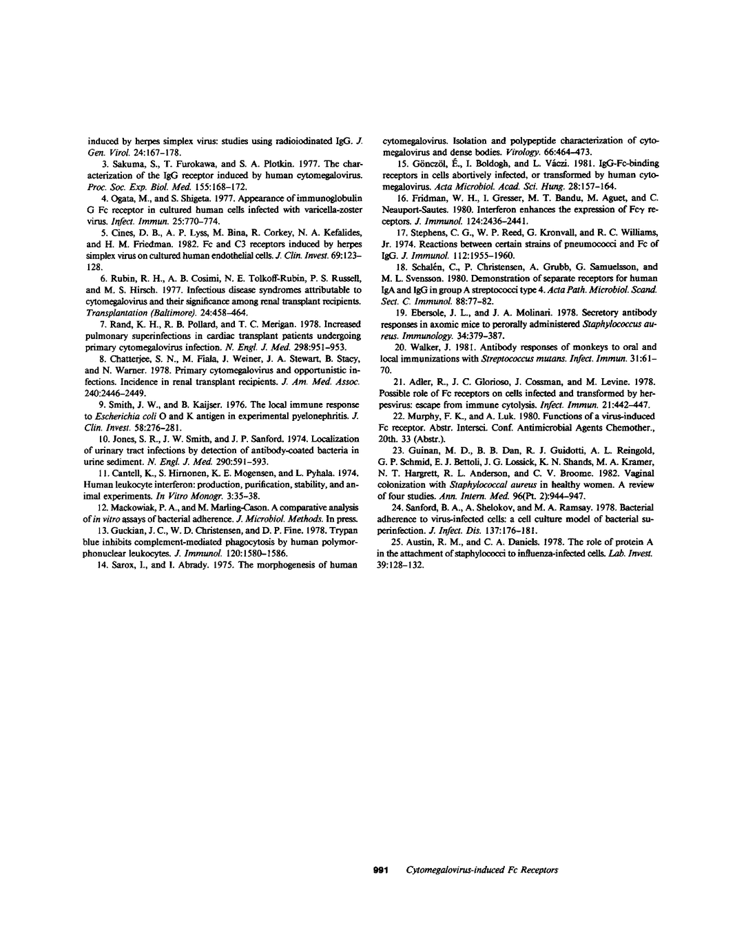 Cytomegalovirus (CMV) and other viruses within the herpes group have recently been shown to induce Fc receptors in infected monolayers. We have examined the possibility that such receptors might facilitate the adherence of antibody-coated bacteria to CMV-infected cells. To do this, we infected confluent human embryonic lung (HEL) cell monolayers with CMV (strain AD 169) and then used a double radiolabel assay to measure adherence of Escherichia coli 06 to both infected and control monolayers. We examined infected monolayers 48 h after viral seeding, at which time 30-60% of the cells exhibited characteristic cytopathic changes. We compared the adherence of untreated E. coli 06 with the adherence of E. coli 06 that had been preincubated for 1 h at 37 degrees C with either nonimmune or anti-E. coli 06 antiserum. Pretreatment of the E. coli 06 with specific antiserum significantly enhanced its adherence to CMV-infected, but not to control, monolayers (P less than 0.01 by the Mann-Whitney U test). We did not see such enhancement when we used anti-E. coli 06 antiserum to treat a nontypable E. coli. The augmented adherence of antibody-coated E. coli 06 to CMV-infected monolayers was abrogated by pretreating the monolayers with nonimmune serum or purified Fc fragments, but not by pretreating with IgA, IgM, or 1 mM trypan blue. Preincubating HEL cell monolayers with 100 U/ml human leukocyte interferon for 72 h at 37 degrees C did not affect the adherence of antibody-coated E. coli 06 to the monolayers. To determine if antibody-coated bacteria that adhered to the surface of CMV-infected monolayers might themselves act as receptors for microorganisms with Fc binding potential, we compared the adherence of Cowan strain Staphylococcus aureus to CMV-infected and control monolayers that had been preincubated with antibody-coated E. coli 06. The S. aureus adhered significantly better to the former monolayers (P less than 0.001). These results illustrate a previously unrecognized mechanism by which certain herpesviruses might enhance the adherence of secondary pathogens to nonphagocytic cell populations. Such a mechanism, if active in vivo, might facilitate the colonization of mucosal surfaces by these pathogenic microorganisms, and in this way might contribute to both the reported predisposition of CMV-infected patients to secondary infections and to the high prevalence of S. aureus in the vaginal flora of women with histories of genital herpes.