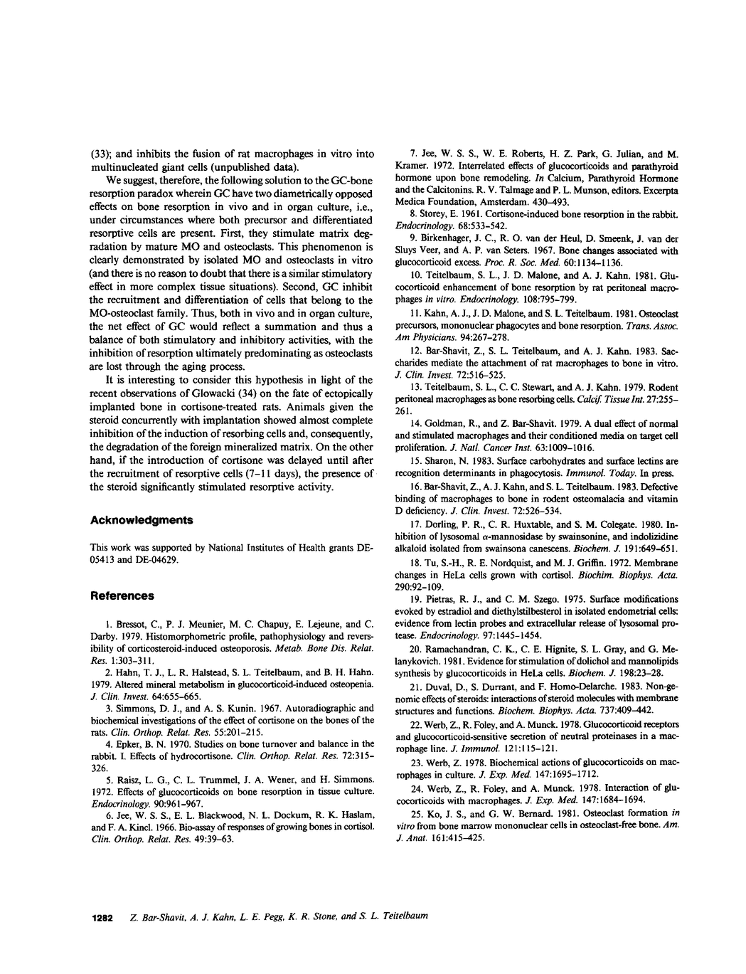 The circumstantial evidence that indicates that glucocorticoids (GC) may stimulate osteoclastic resorption in vivo has recently found support in observations that demonstrate that these compounds effectively increase the activity of isolated resorptive cells (osteoclasts, macrophage polykaryons, and elicited macrophages [MO] ) in vitro. Data are presented here that indicate that this stimulation by GC is due to an enhancement of the initial stage of the resorption process, the attachment of cells to bone, and that this is caused by alterations of cell surface oligosaccharides. Specifically, dexamethasone and cortisol enhance by 80% the attachment of MO to bone surfaces in a dose dependent manner but do not alter or reduce the binding of these cells to other surfaces (plastic, collagen, and hydroxyapatite crystals). The effect of GC on cell-bone attachment is blocked by the glycosylation inhibitor, tunicamycin, and the glycosylation modifier, swainsonine; this demonstrates that asparagine-linked oligosaccharides are involved in the stimulatory process. Flow cytometric analysis of GC-treated cells using a panel of fluoresceinated lectins confirms this by indicating a selective, enhanced exposure of plasma membrane-associated N-acetylglucosamine and N-acetylgalactosamine residues, sugars we have previously shown to be pivotal in MO-bone binding. Finally, progesterone, a known GC antagonist, blocks GC-stimulated resorption, macrophage-bone binding, and membrane oligosaccharide modification, presumably by competing for the GC receptor. Progesterone alone alters none of these processes. Thus, GC stimulates the resorptive activity of macrophages by enhancing the initial events in the degradative process (cell-bone binding) and does so, apparently, via receptor-mediator alteration of cell surface glycoproteins.