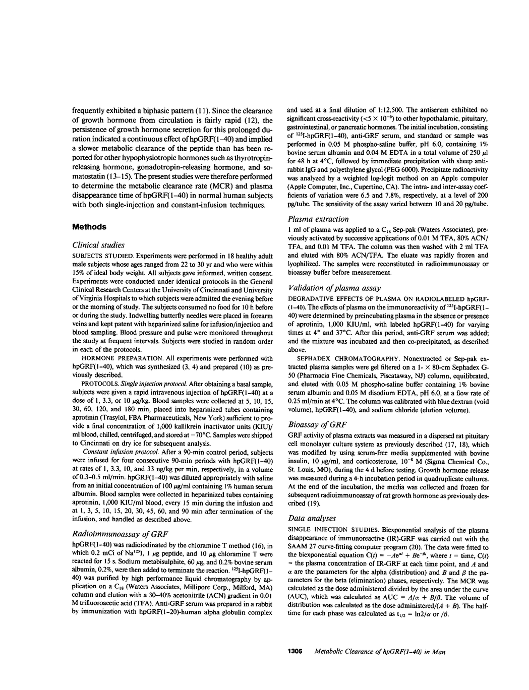 The metabolic clearance rate (MCR) and plasma disappearance rate (t1/2) of human pancreatic tumor growth hormone releasing factor [hpGRF(1-40)] was determined in normal adult male subjects by single injection and constant infusion techniques. Single injections of 1, 3.3, and 10 micrograms/kg hpGRF(1-40) were administered intravenously, plasma immunoreactive (IR) GRF levels were measured during the subsequent 180 min, and biexponential curve analysis was performed. Graded, dose-constant infusions of hpGRF(1-40) at rates of 1, 3.3, 10, and 33 ng/kg per min were administered and the MCR was calculated from measurement of steady state plasma IR-GRF levels at each infusion rate. The postinfusion disappearance rate was determined by linear regression analysis of plasma IR-GRF levels during the 120-min period after cessation of the infusion. The calculated MCR during the single injection study was 194 +/- 17.5 liters/m2 per d and was not significantly different from the calculated value during the constant infusion study (202 +/- 16 liters/m2 per d). The disappearance rate during the single injection study was subdivided into two linear phases: an initial equilibration phase (7.6 +/- 1.2 min) and a subsequent elimination phase (51.8 +/- 5.4 min). The latter was similar to the linear disappearance rate observed (41.3 +/- 3.0 min) after cessation of the constant infusion. The chromatographic and biologic characteristics of plasma IR-GRF, 30 min after injection, were similar to those of synthetic hpGRF(1-40). The results have been discussed in relation to the MCR of other hypothalamic hormones and have been used to extrapolate secretion rates of GRF in patients with ectopic GRF production.