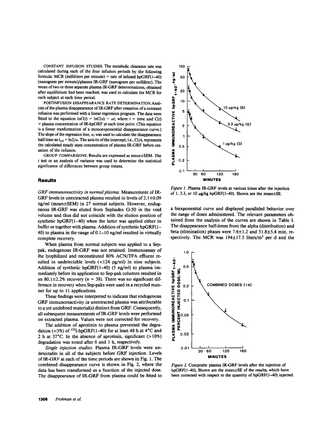 The metabolic clearance rate (MCR) and plasma disappearance rate (t1/2) of human pancreatic tumor growth hormone releasing factor [hpGRF(1-40)] was determined in normal adult male subjects by single injection and constant infusion techniques. Single injections of 1, 3.3, and 10 micrograms/kg hpGRF(1-40) were administered intravenously, plasma immunoreactive (IR) GRF levels were measured during the subsequent 180 min, and biexponential curve analysis was performed. Graded, dose-constant infusions of hpGRF(1-40) at rates of 1, 3.3, 10, and 33 ng/kg per min were administered and the MCR was calculated from measurement of steady state plasma IR-GRF levels at each infusion rate. The postinfusion disappearance rate was determined by linear regression analysis of plasma IR-GRF levels during the 120-min period after cessation of the infusion. The calculated MCR during the single injection study was 194 +/- 17.5 liters/m2 per d and was not significantly different from the calculated value during the constant infusion study (202 +/- 16 liters/m2 per d). The disappearance rate during the single injection study was subdivided into two linear phases: an initial equilibration phase (7.6 +/- 1.2 min) and a subsequent elimination phase (51.8 +/- 5.4 min). The latter was similar to the linear disappearance rate observed (41.3 +/- 3.0 min) after cessation of the constant infusion. The chromatographic and biologic characteristics of plasma IR-GRF, 30 min after injection, were similar to those of synthetic hpGRF(1-40). The results have been discussed in relation to the MCR of other hypothalamic hormones and have been used to extrapolate secretion rates of GRF in patients with ectopic GRF production.