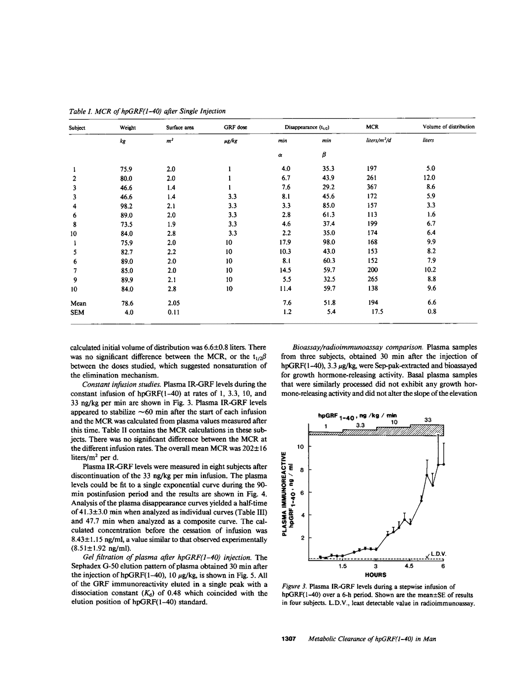 The metabolic clearance rate (MCR) and plasma disappearance rate (t1/2) of human pancreatic tumor growth hormone releasing factor [hpGRF(1-40)] was determined in normal adult male subjects by single injection and constant infusion techniques. Single injections of 1, 3.3, and 10 micrograms/kg hpGRF(1-40) were administered intravenously, plasma immunoreactive (IR) GRF levels were measured during the subsequent 180 min, and biexponential curve analysis was performed. Graded, dose-constant infusions of hpGRF(1-40) at rates of 1, 3.3, 10, and 33 ng/kg per min were administered and the MCR was calculated from measurement of steady state plasma IR-GRF levels at each infusion rate. The postinfusion disappearance rate was determined by linear regression analysis of plasma IR-GRF levels during the 120-min period after cessation of the infusion. The calculated MCR during the single injection study was 194 +/- 17.5 liters/m2 per d and was not significantly different from the calculated value during the constant infusion study (202 +/- 16 liters/m2 per d). The disappearance rate during the single injection study was subdivided into two linear phases: an initial equilibration phase (7.6 +/- 1.2 min) and a subsequent elimination phase (51.8 +/- 5.4 min). The latter was similar to the linear disappearance rate observed (41.3 +/- 3.0 min) after cessation of the constant infusion. The chromatographic and biologic characteristics of plasma IR-GRF, 30 min after injection, were similar to those of synthetic hpGRF(1-40). The results have been discussed in relation to the MCR of other hypothalamic hormones and have been used to extrapolate secretion rates of GRF in patients with ectopic GRF production.