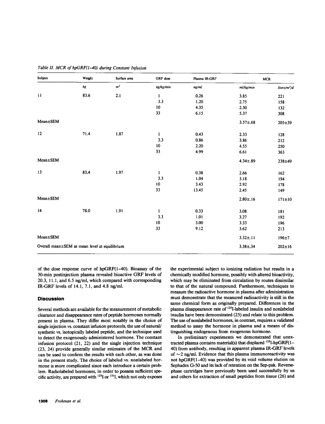 The metabolic clearance rate (MCR) and plasma disappearance rate (t1/2) of human pancreatic tumor growth hormone releasing factor [hpGRF(1-40)] was determined in normal adult male subjects by single injection and constant infusion techniques. Single injections of 1, 3.3, and 10 micrograms/kg hpGRF(1-40) were administered intravenously, plasma immunoreactive (IR) GRF levels were measured during the subsequent 180 min, and biexponential curve analysis was performed. Graded, dose-constant infusions of hpGRF(1-40) at rates of 1, 3.3, 10, and 33 ng/kg per min were administered and the MCR was calculated from measurement of steady state plasma IR-GRF levels at each infusion rate. The postinfusion disappearance rate was determined by linear regression analysis of plasma IR-GRF levels during the 120-min period after cessation of the infusion. The calculated MCR during the single injection study was 194 +/- 17.5 liters/m2 per d and was not significantly different from the calculated value during the constant infusion study (202 +/- 16 liters/m2 per d). The disappearance rate during the single injection study was subdivided into two linear phases: an initial equilibration phase (7.6 +/- 1.2 min) and a subsequent elimination phase (51.8 +/- 5.4 min). The latter was similar to the linear disappearance rate observed (41.3 +/- 3.0 min) after cessation of the constant infusion. The chromatographic and biologic characteristics of plasma IR-GRF, 30 min after injection, were similar to those of synthetic hpGRF(1-40). The results have been discussed in relation to the MCR of other hypothalamic hormones and have been used to extrapolate secretion rates of GRF in patients with ectopic GRF production.