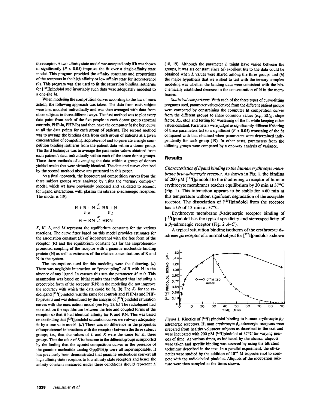 Decreased activity of the guanine nucleotide regulatory protein (N) of the adenylate cyclase system is present in cell membranes of some patients with pseudohypoparathyrodism (PHP-Ia) whereas others have normal activity of N (PHP-Ib). Low N activity in PHP-Ia results in a decrease in hormone (H)-stimulatable adenylate cyclase in various tissues, which might be due to decreased ability to form an agonist-specific high affinity complex composed of H, receptor (R), and N. To test this hypothesis, we compared beta-adrenergic agonist-specific binding properties in erythrocyte membranes from five patients with PHP-Ia (N = 45% of control), five patients with PHP-Ib (N = 97%), and five control subjects. Competition curves that were generated by increasing concentrations of the beta-agonist isoproterenol competing with [125I]pindolol were shallow (slope factors less than 1) and were computer fit to a two-state model with corresponding high and low affinity for the agonist. The agonist competition curves from the PHP-Ia patients were shifted significantly (P less than 0.02) to the right as a result of a significant (P less than 0.01) decrease in the percent of beta-adrenergic receptors in the high affinity state from 64 +/- 22% in PHP-Ib and 56 +/- 5% in controls to 10 +/- 8% in PHP-Ia. The agonist competition curves were computer fit to a "ternary complex" model for the two-step reaction: H + R + N in equilibrium HR + N in equilibrium HRN. The modeling was consistent with a 60% decrease in the functional concentration of N, and was in good agreement with the biochemically determined decrease in erythrocyte N protein activity. These in vitro findings in erythrocytes taken together with the recent observations that in vivo isoproterenol-stimulated adenylate cyclase activity is decreased in patients with PHP (Carlson, H. E., and A. S. Brickman, 1983, J. Clin. Endocrinol. Metab. 56:1323-1326) are consistent with the notion that N is a bifunctional protein interacting with both R and the adenylate cyclase. It may be that in patients with PHP-Ia a single molecular and genetic defect accounts for both decreased HRN formation and decreased adenylate cyclase activity, whereas in PHP-Ib the biochemical lesion(s) appear not to affect HRN complex formation.