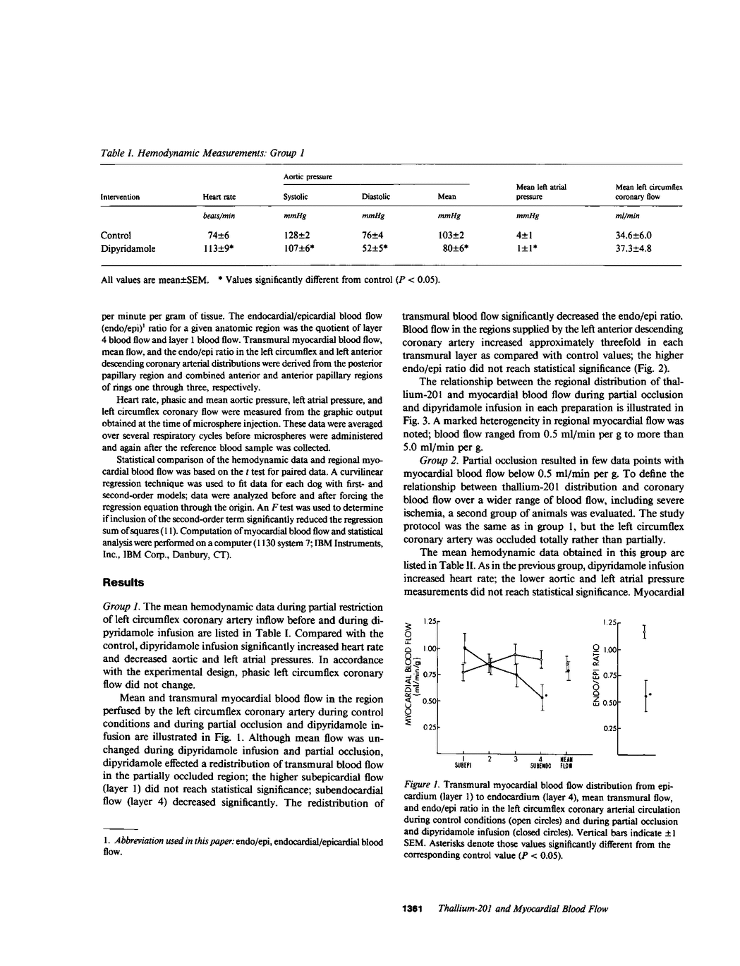 This study assesses the relationship between the distribution of thallium-201 and myocardial blood flow during coronary vasodilation induced by intravenous dipyridamole in canine models of partial and complete coronary artery stenosis. 10 dogs were chronically instrumented with catheters in the left atrium and aorta and with a balloon occluder and electromagnetic flow probe on the proximal left circumflex coronary artery. Regional myocardial blood flow was measured during control conditions with radioisotope-labeled microspheres, and the phasic reactive hyperemic response to a 20-s transient occlusion was then recorded. Dipyridamole was then infused intravenously until phasic coronary blood flow increased to match peak hyperemic values. The left circumflex coronary artery was either partially occluded to reduce phasic blood flow to control values (group 1) or it was completely occluded (group 2), and thallium-201 and a second microsphere label were injected. 5 min later, the animals were sacrificed, the left ventricle was sectioned into 1-2-g samples, and thallium-201 activity and regional myocardial blood flow were measured. Curvilinear regression analyses between thallium-201 localization and myocardial blood flow during dipyridamole infusion demonstrated a slightly better fit to a second- as compared with a first-order model, indicating a slight roll-off of thallium activity as myocardial blood flow increases. During the dipyridamole infusion, the increases in phasic blood flow, the distributions of regional myocardial blood flow, and the relationships between thallium-201 localization and regional blood flow were comparable to values previously observed in exercising dogs with similar occlusions. These data provide basic validation that supports the use of intravenous dipyridamole and thallium-201 as an alternative to exercise stress and thallium-201 for evaluating the effects of coronary occlusive lesions on the distribution of regional myocardial blood flow.