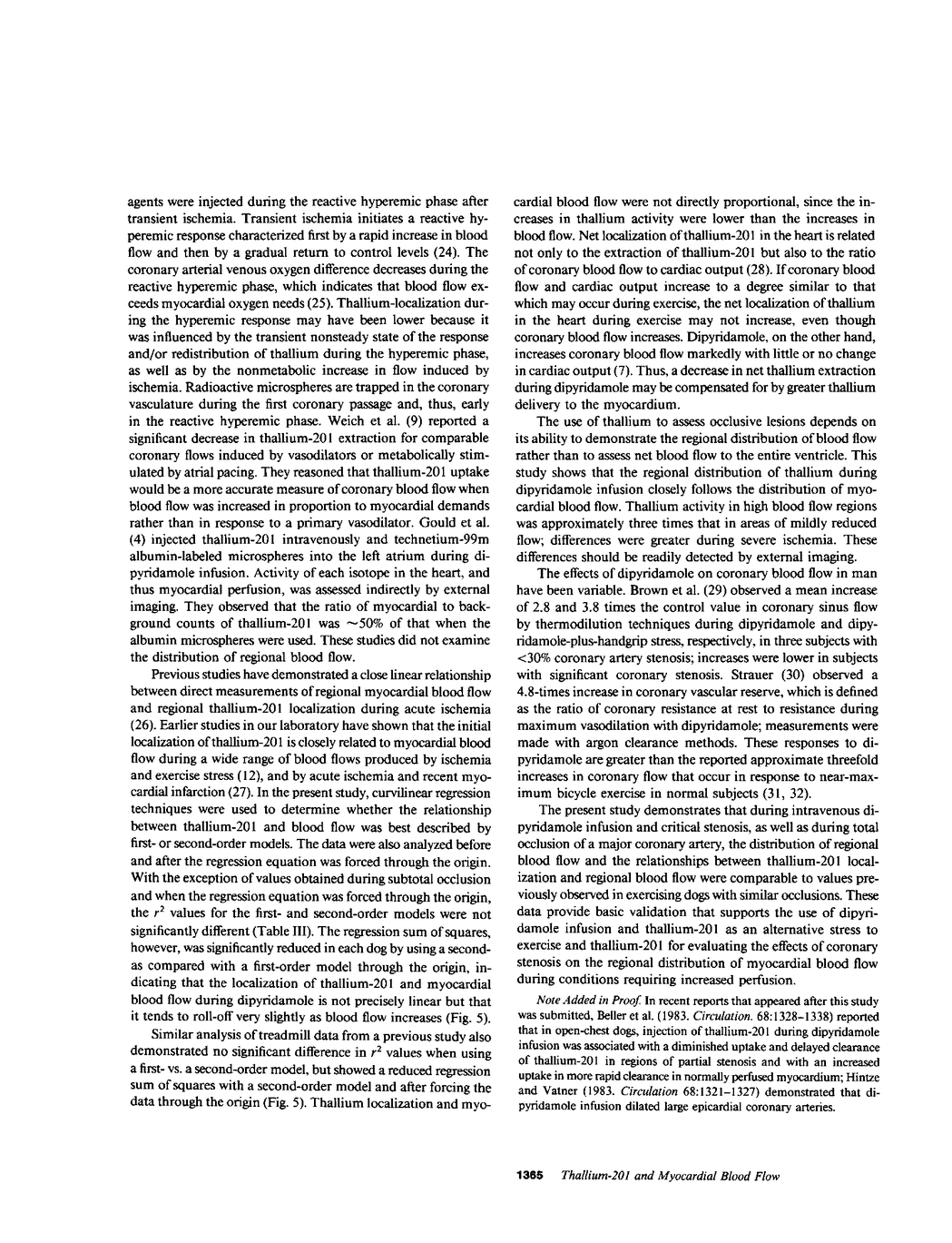 This study assesses the relationship between the distribution of thallium-201 and myocardial blood flow during coronary vasodilation induced by intravenous dipyridamole in canine models of partial and complete coronary artery stenosis. 10 dogs were chronically instrumented with catheters in the left atrium and aorta and with a balloon occluder and electromagnetic flow probe on the proximal left circumflex coronary artery. Regional myocardial blood flow was measured during control conditions with radioisotope-labeled microspheres, and the phasic reactive hyperemic response to a 20-s transient occlusion was then recorded. Dipyridamole was then infused intravenously until phasic coronary blood flow increased to match peak hyperemic values. The left circumflex coronary artery was either partially occluded to reduce phasic blood flow to control values (group 1) or it was completely occluded (group 2), and thallium-201 and a second microsphere label were injected. 5 min later, the animals were sacrificed, the left ventricle was sectioned into 1-2-g samples, and thallium-201 activity and regional myocardial blood flow were measured. Curvilinear regression analyses between thallium-201 localization and myocardial blood flow during dipyridamole infusion demonstrated a slightly better fit to a second- as compared with a first-order model, indicating a slight roll-off of thallium activity as myocardial blood flow increases. During the dipyridamole infusion, the increases in phasic blood flow, the distributions of regional myocardial blood flow, and the relationships between thallium-201 localization and regional blood flow were comparable to values previously observed in exercising dogs with similar occlusions. These data provide basic validation that supports the use of intravenous dipyridamole and thallium-201 as an alternative to exercise stress and thallium-201 for evaluating the effects of coronary occlusive lesions on the distribution of regional myocardial blood flow.