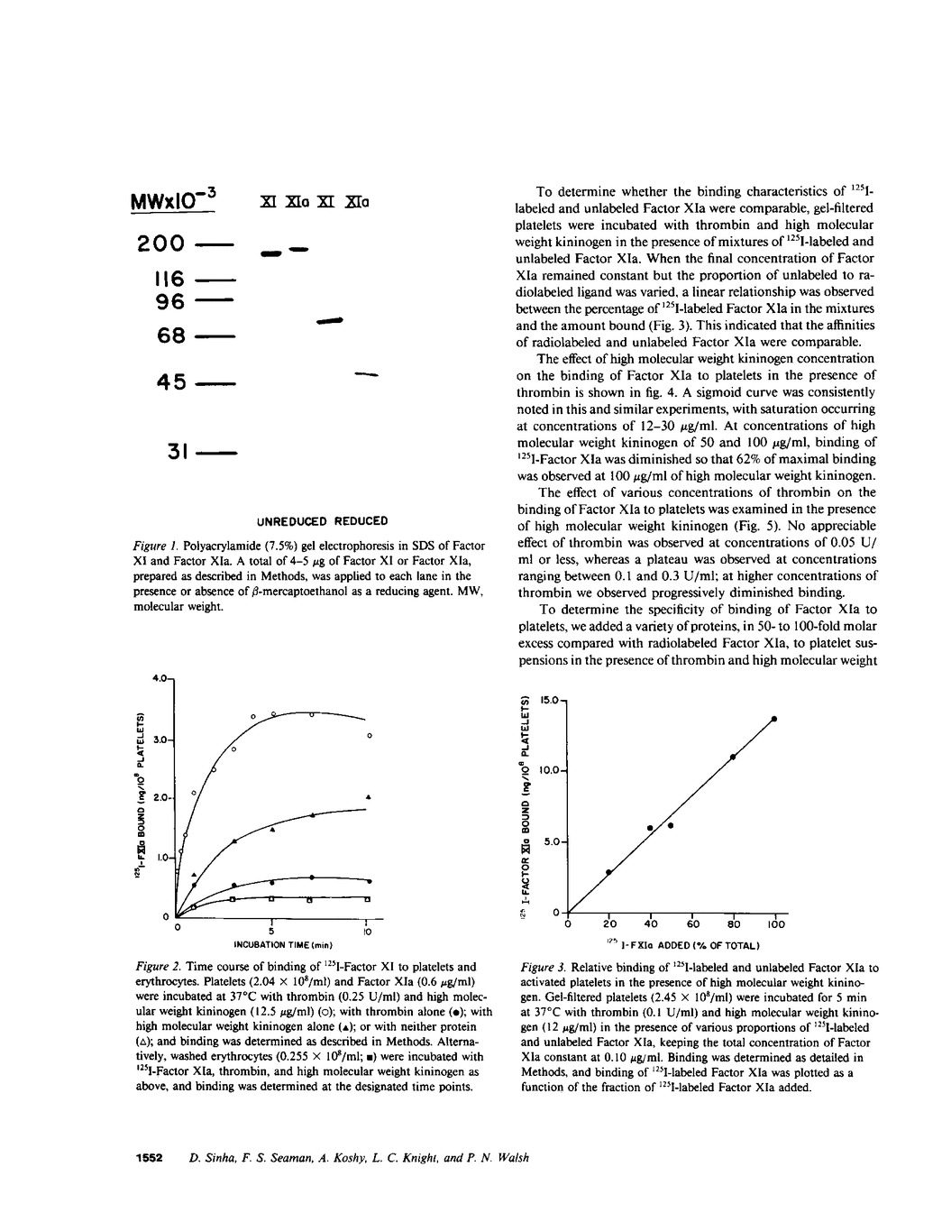 Binding of 125I-Factor XIa to platelets required the presence of high molecular weight kininogen, was enhanced when platelets were stimulated with thrombin, and reached a plateau after 4-6 min of incubation at 37 degrees C. Factor XIa binding was specific: 50- to 100-fold molar excesses of unlabeled Factor XIa prevented binding, whereas Factor XI, prekallikrein, Factor XIIa, and prothrombin did not. When washed erythrocytes, added at concentrations calculated to provide an equivalent surface area to platelets, were incubated with Factor XIa, only a low level of nonspecific, nonsaturable binding was detected. Factor XIa binding to platelets was partially reversible and was saturable at concentrations of added Factor XIa of 0.2-0.4 microgram/ml (1.25-2.5 microM). The number of Factor XIa binding sites on activated platelets was estimated to be 225 per platelet (range, 110-450). We conclude that specific, high affinity, saturable binding sites for Factor XIa are present on activated platelets, are distinct from those previously demonstrated for Factor XI, and require the presence of high molecular weight kininogen.