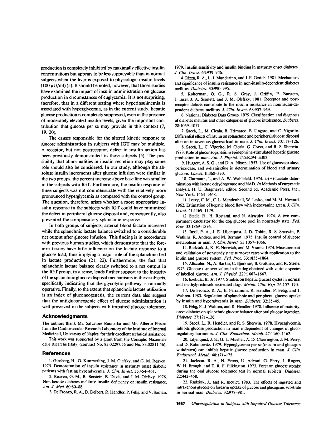 To identify the mechanism(s) of the altered glucoregulatory response to a glucose load in subjects with impaired glucose tolerance, we selectively quantitated the components of net splanchnic glucose balance, i.e., splanchnic glucose uptake and hepatic glucose output, as well as peripheral glucose uptake, by combining [3-3H]glucose infusion with hepatic vein catheterization. After intravenous glucose infusion (6 mg X kg-1 X min-1 for 90 min), blood glucose rose to 172 +/- 7 mg/dl in controls and 232 +/- 13 mg/dl in subjects with impaired glucose tolerance (P less than 0.01). The response of plasma insulin did not differ significantly between the two groups (29 +/- 4 vs. 40 +/- 10 microU/ml at 90 min in control and in glucose intolerant subjects, respectively; P = NS). In both groups, glucose infusion caused the net splanchnic glucose balance to switch from the net output of the basal state to a net glucose uptake. However, this effect was more marked in subjects with impaired glucose tolerance than in control subjects (at 90 min: 2.83 +/- 0.53 vs. 1.60 +/- 0.18 mg X kg-1 X min-1, respectively: P less than 0.05). The different pattern of splanchnic glucose balance was entirely accounted for by a greater rise in splanchnic glucose uptake in the group of glucose intolerants , as the suppression of endogenous glucose output by the glucose load was practically complete in both groups. In contrast, glucose uptake by peripheral tissues increased considerably less in subjects with impaired glucose tolerance than in controls (2.2-2.6 vs 3.6-4.1 mg X kg-1 X min-1, respectively, between 60 and 90 min; P less than 0.01-0.001). Furthermore, a net splanchnic lactate uptake was present in the basal state, which was inhibited by the glucose load and switched to a comparable net lactate output in both groups. These results indicate that the mechanism responsible for the altered glucoregulation in subjects with impaired glucose tolerance resides entirely in the peripheral tissues whose ability to dispose of a glucose load is drastically reduced. On the other hand, no defect is detectable in any of the explored mechanisms regulating splanchnic glucose metabolism during the disposal of an exogenous glucose load.