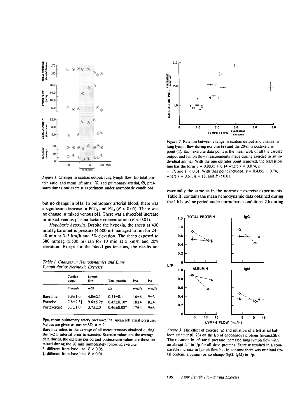 Vigorous exercise causes a marked increase in cardiac output with only a minimal increase in measureable pulmonary vascular pressures. These changes in pulmonary hemodynamics should affect lung water and solute movement. On nine occasions, we measured the effect of normoxic exercise on lung lymph flow in four sheep and two goats with chronic lymph fistulas (wt = 15-25 kg). In addition, lymph flow was also measured on five occasions in sheep during exercise at reduced barometric pressures (430 and 380 mmHg). During normobaria, the animals ran at 3-5 km/h with 0-10% elevation of the treadmill for 15 to 85 min. Exercise on average caused a 100% increase in cardiac output, a 140% increase in lung lymph flow, and a slight but significant reduction in lymph to plasma concentration ratio (l/p) for total protein and albumin (mol wt = 70,000). There was a significant linear correlation between lymph flow and cardiac output (r = 0.87, P less than 0.01). There was no change in l/p for IgG (mol wt = 150,000) or IgM (mol wt = 900,000) and no significant change in mean pulmonary arterial (Ppa) or mean left atrial (Pla) pressures. Transition from normobaria to hypobaria caused an increase in Ppa but no change in Pla, cardiac output, or lymph flow. Exercise during hypobaria caused increases in lymph flow that were qualitatively similar to changes observed during normobaric exercise: there was a 60% increase in cardiac output, a 90% increase in lymph flow, and an 11% reduction in l/p for total protein. There was no change in l/p for albumin, IgG, or IgM, and no further change in Ppa. The increased lymph flow during normoxic and hypobaric exercise is best explained by an increase in pulmonary vascular surface area for fluid and protein exchange. Our results suggest that the normal ovine lung has the potential to nearly triple the amount of perfused microvascular surface area. This speculation is relevant to the interpretation of lymph flow data from other experiments.