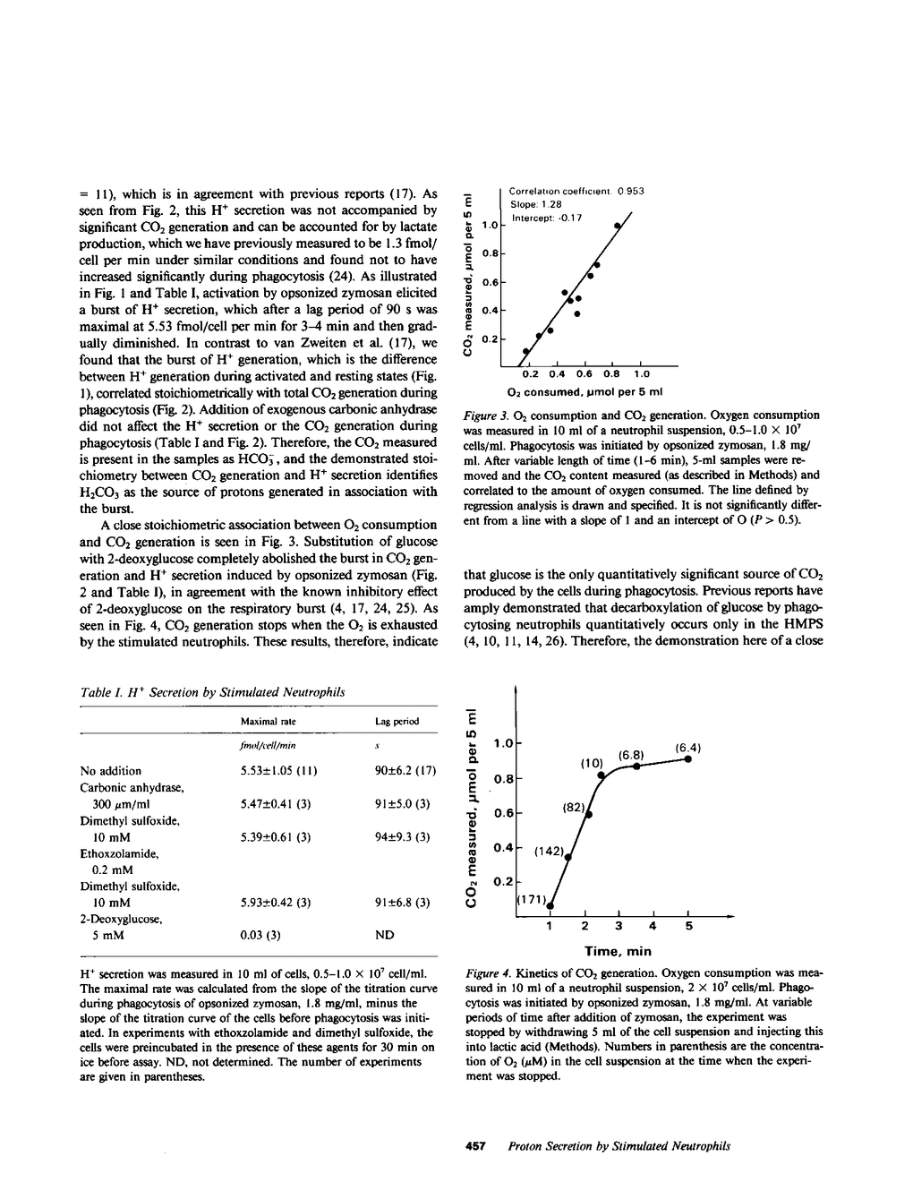 Phagocytosis by neutrophils is accompanied by a burst in O2 consumption and activation of the hexose monophosphate shunt (HMPS). Proton secretion equal to the amount of O2 consumed is an additional feature of the respiratory burst, but its source has not been identified, nor has the source of all electrons donated to O2 in the respiratory burst. We chemically quantitated total CO2 generation in human neutrophils and found that proton secretion elicited by phagocytosis was accompanied by a stoichiometric increase in CO2 generation. Addition of carbonic anhydrase and its inhibitors had no effect on either the quantities of CO2 measured or the quantities of protons secreted. Therefore, the CO2 generated in the respiratory burst of stimulated neutrophils is hydrated to form H2CO3, which then dissociates, accounting for the observed proton secretion. Furthermore, the CO2 generated corresponds to the O2 consumed with a respiratory quotient of nearly 1. We conclude on the basis of this and previous studies that the HMPS activity is the source of both the electrons for the NADPH oxidase and of protons secreted in association with the respiratory burst.