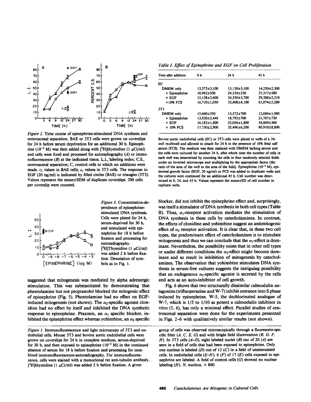 We have found that catecholamines stimulate DNA synthesis and centrosomal separation in 3T3 and bovine aortic endothelial cells cultured in the absence of serum or added growth factors. The mitogenic effect is mediated by an alpha 1-adrenergic receptor, as it is inhibited by phentolamine and prazosin but not by propranolol or yohimbine. The physiological and pathological consequences of this effect remain to be determined.