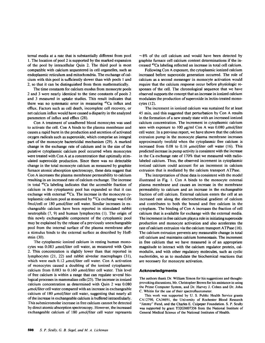 We have performed a comprehensive study of calcium tracer flux, distribution, content, and ionized cytoplasmic calcium during monocyte activation. A model of monocyte calcium was developed from 45Ca uptake and exodus curves which indicated that cell calcium was partitioned between three compartments. The magnitude of the time constants for each pool lead us to propose cellular locations for these three compartments: a surface plasma membrane pool, a cytoplasmic pool, and an organelle pool. 45Ca uptake and exodus experiments were analyzed using a nonlinear least squares fit of compartmental exchange rates and sizes. The production of superoxide was used as a reflection of the state of activation of the monocytes treated with Concanavalin A (Con A). We found that Con A-treated monocytes have an increase in the calcium exchange rate with the cytoplasmic pool from 0.04 to 0.07/min (P less than 0.05), and an increase in the size of the cytoplasmic pool from 0.08 to 0.13 pmol/cell (P less than 0.05). There were no significant changes in the exchange rates or sizes associated with either of the other two compartments. The cytoplasmic ionized calcium was measured with the fluorescent probe, Quin 2, which indicated a resting level of 83 nM free calcium in unadhered monocytes. Con A stimulation caused a doubling of the cytoplasmic free calcium to 163 nM within 45 s. This increment in cytoplasmic free calcium preceded the onset of superoxide following Con A treatment. These studies indicate that Con A binding to the plasma membrane increases the monocyte plasma membrane permeability to calcium. External calcium enters the cell at an increased rate and contributes to both internally bound and free calcium. The magnitude of the increase in free calcium is proportional to the concentration of Con A and stimulates calcium extrusion via the calcium transport ATPase. Moreover, there is an increased concentration of ionized cytoplasmic calcium which has the potential to interact with other cellular regulators that modulate cell activation and superoxide production.