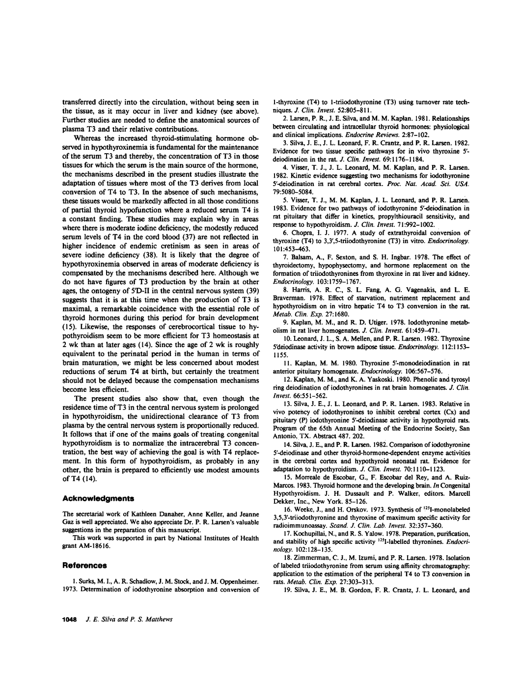 Local 5'-deiodination of serum thyroxine (T4) is the main source of triiodothyronine (T3) for the brain. Since we noted in previous studies that the cerebral cortex of neonatal rats tolerated marked reductions in serum T4 without biochemical hypothyroidism, we examined the in vivo T4 and T3 metabolism in that tissue and in the cerebellum of euthyroid and hypothyroid 2-wk-old rats. We also assessed the contribution of enhanced tissue T4 to T3 conversion and decreased T3 removal from the tissues to the T3 homeostasis in hypothyroid brain. Congenital and neonatal hypothyroidism was induced by adding methimazole to the drinking water. Serum, cerebral cortex (Cx), cerebellum (Cm), liver (L) and kidney (R) concentrations of 125I-T4, 125I-T3(T4), and 131I-T3 were measured at various times after injecting 125I-T4 and 131I-T3. The rate of T3 removal from the tissues was measured after injecting an excess of anti-T3-antibody to rats previously injected with tracer T3. In euthyroid rats, fractional turnover rates of T3 per hour were: Cx, 0.26 +/- 0.02 (SE); Cm, 0.20 +/- 0.02; L, 0.98 +/- 0.07; R, 0.97 +/- 0.12; and the calculated unidirectional plasma T3 clearance by these tissues were, in milliliters per gram per hour: Cx = 0.38, Cm = 0.32, L = 5.0, and R = 5.6. In hypothyroidism, the fractional removal rates and clearances were reduced in all tissues, in cortex and cerebellum by 70%, and in liver and kidney ranging from 30 to 50%. While greater than 80% of the 125I-T3(T4) in the brain tissues of euthyroid rats was locally produced, in hypothyroid cerebral cortex and cerebellum the integrated concentrations of 125I-T3(T4) were 2.7- and 1.5-fold greater than in euthyroid rats. In the Cx, this response resulted from an approximately sixfold increase in fractional conversion and an approximately fourfold decrease in T3 removal rate hampered by a decreased uptake of T4 from plasma, whereas in Cm the response resulted only from the reduced T3 removal rate. In euthyroid rats, the calculated production rate of T3 in nanograms per gram per hour by the Cx was 0.96 and 0.89 by the Cm, which on a per organ basis equals 15 and 2%, respectively, of the extrathyroidal production rate as assessed in the body pool exchanging with plasma. Several conclusions can be drawn: Production of T3 by developing brain is a very active process in agreement with the need of thyroid hormones during this period. (b) The brain-plasma exchange of T3 is slow compared with that of L or R. (c) This, along with the active local production, explains the predominant role of the latter as a source of T3 for the brain. (d) In hypothyroidism, the Cx is protected by an increase in the efficiency of T4 to T3 conversion and a prolong residence time of T3 in the tissue, whereas the Cm is protected only by the latter. Because of the large fraction of the T3 produced locally and the active turnover rate of T3 in the brain, reductions in T3 removal rate are of utmost importance for T3 homeostasis in these tissues.