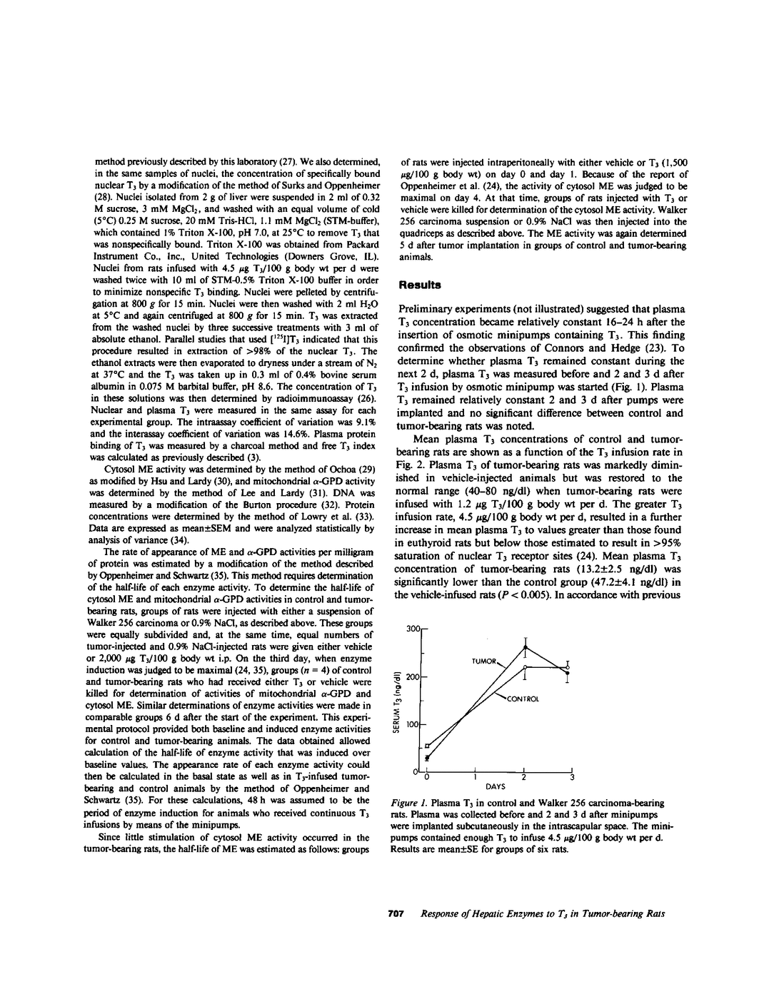 To characterize the hepatic response to L-triiodothyronine (T3) in an experimental nonthyroidal disease, we determined the activity of hepatic mitochondrial alpha-glycerophosphate dehydrogenase (alpha-GPD) and cytosol malic enzyme (ME) as a function of the saturation of the nuclear T3 receptor during constant T3 infusions in rats bearing the Walker 256 carcinoma. Groups of control and tumor-bearing rats were infused by minipumps (Alza Corp., Palo Alto, CA) with vehicle, 1.2 or 4.5 micrograms T3/100 body wt per day for 3 d. The range for serum T3 was 47.2 +/- 4.1 to 165 +/- 17.3 ng/dl for the control rats and 13.2 +/- 1.3 to 135 +/- 14.3 ng/dl for the tumor-bearing rats. Nuclear T3 receptor concentration was between 0.41 +/- 0.06 and 0.47 +/- 0.02 ng/mg DNA in control rats and was decreased in tumor-bearing rats to between 0.23 +/- 0.03 and 0.26 +/- 0.03 ng/mg DNA. Nuclear T3 receptor concentrations were not influenced by the T3 infusions. Specifically bound nuclear T3, determined by radioimmunoassay of extracts of isolated nuclei, was decreased nearly 50% in the tumor-bearing rats. However, the calculated percentage saturation of the T3 nuclear receptor remained similar in control and tumor-bearing rats at each level of T3 infusion. Dose-response curves for alpha-GPD and ME were curvilinear and showed an exponential increase in enzyme activity with progressive receptor saturation. In tumor-bearing rats, the activity curves or calculated appearance rate curves for alpha-GPD were shifted significantly upward and to the left, indicating greater sensitivity to T3, and those of ME were shifted downward and to the right, indicating decreased responsiveness to T3. Our findings suggest that cellular factors result in postreceptor amplification of the alpha-GPD response and diminution of the ME response to T3 in tumor-bearing rats. Augmentation of the alpha-GPD response may be a prototype for other hormonal responses that enable the tumor-bearing rat to maintain an apparent euthyroid state in association with decreased serum T3.