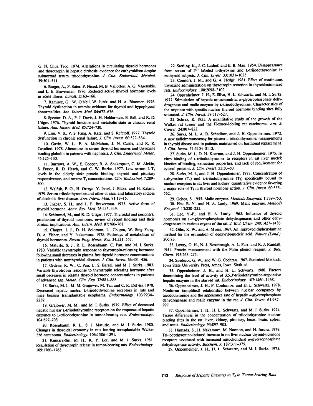 To characterize the hepatic response to L-triiodothyronine (T3) in an experimental nonthyroidal disease, we determined the activity of hepatic mitochondrial alpha-glycerophosphate dehydrogenase (alpha-GPD) and cytosol malic enzyme (ME) as a function of the saturation of the nuclear T3 receptor during constant T3 infusions in rats bearing the Walker 256 carcinoma. Groups of control and tumor-bearing rats were infused by minipumps (Alza Corp., Palo Alto, CA) with vehicle, 1.2 or 4.5 micrograms T3/100 body wt per day for 3 d. The range for serum T3 was 47.2 +/- 4.1 to 165 +/- 17.3 ng/dl for the control rats and 13.2 +/- 1.3 to 135 +/- 14.3 ng/dl for the tumor-bearing rats. Nuclear T3 receptor concentration was between 0.41 +/- 0.06 and 0.47 +/- 0.02 ng/mg DNA in control rats and was decreased in tumor-bearing rats to between 0.23 +/- 0.03 and 0.26 +/- 0.03 ng/mg DNA. Nuclear T3 receptor concentrations were not influenced by the T3 infusions. Specifically bound nuclear T3, determined by radioimmunoassay of extracts of isolated nuclei, was decreased nearly 50% in the tumor-bearing rats. However, the calculated percentage saturation of the T3 nuclear receptor remained similar in control and tumor-bearing rats at each level of T3 infusion. Dose-response curves for alpha-GPD and ME were curvilinear and showed an exponential increase in enzyme activity with progressive receptor saturation. In tumor-bearing rats, the activity curves or calculated appearance rate curves for alpha-GPD were shifted significantly upward and to the left, indicating greater sensitivity to T3, and those of ME were shifted downward and to the right, indicating decreased responsiveness to T3. Our findings suggest that cellular factors result in postreceptor amplification of the alpha-GPD response and diminution of the ME response to T3 in tumor-bearing rats. Augmentation of the alpha-GPD response may be a prototype for other hormonal responses that enable the tumor-bearing rat to maintain an apparent euthyroid state in association with decreased serum T3.