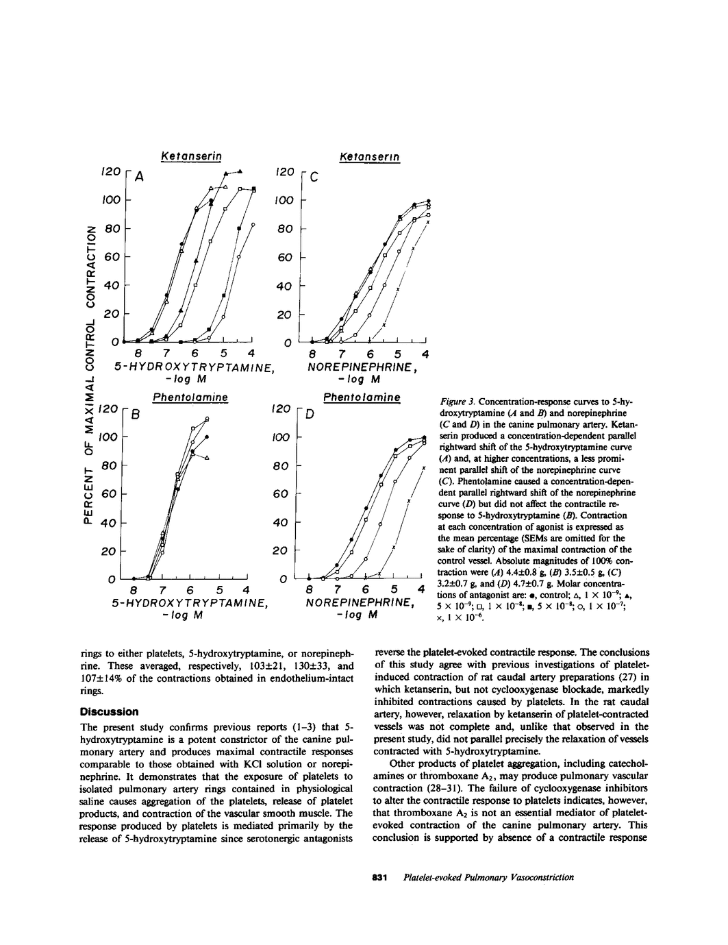 To examine the effect of platelets and 5-hydroxytryptamine on pulmonary arterial smooth muscle, rings of canine pulmonary arteries, with and without endothelium, were studied under isometric conditions in physiological salt solution. 5-Hydroxytryptamine, but not the thromboxane-like endoperoxide analogue U-46619, produced concentration-dependent contractions of the rings with a maximum averaging 93% of that obtained with KC1. Autologous platelets in concentrations comparable to that in plasma caused contractions averaging 70% of the maximal responses to KC1. Solution withdrawn from baths containing platelet-contracted rings, but not the supernatant from nonaggregated platelets, also caused contraction. The serotonergic antagonists cyproheptadine, ketanserin, and methysergide caused concentration-dependent inhibition and eventually abolition of contractions evoked by platelets and 5-hydroxytryptamine. Phentolamine and prazosin produced significantly less inhibition of the contractile response to platelets. Pretreatment of the platelets with indomethacin or meclofenamate reduced thromboxane release but had no effect on platelet-induced contractions. Removal of the endothelium did not affect contractile responses to platelets or 5-hydroxy-tryptamine. These experiments demonstrate that in the canine pulmonary artery: (a) 5-hydroxytryptamine is the predominant mediator of the contractile response triggered by platelet aggregation; and (b) unlike in other blood vessels, the endothelium cannot curtail the contractile response to aggregating platelets.