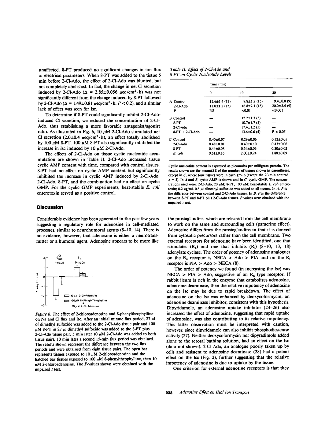 Adenosine receptors that modulate adenylate cyclase activity have been identified recently in a number of tissues. The purpose of these investigations was to determine the effect of adenosine on ion transport in rabbit ileum in vitro. Adenosine and some of its analogues were found to increase the short circuit current (Isc) and the order of potency was N-ethylcarboxamide-adenosine greater than or equal to 2-chloroadenosine greater than phenylisopropyladenosine greater than adenosine. Purine-intact adenosine analogues had no effect on Isc. The effect of adenosine on Isc was enhanced by deoxycoformycin, an adenosine deaminase inhibitor, and by dipyridamole, an adenosine uptake inhibitor. The increase in Isc induced by 2-chloroadenosine was partially reversed in a dose-dependent manner by 8-phenyltheophylline but not by theophylline or isobutylmethylxanthine. 2-Chloroadenosine increased cyclic AMP content, and stimulated net Cl secretion; these effects were partially blocked by 8-phenyltheophylline. These results suggest that there is an adenosine receptor on rabbit ileal mucosal cells that stimulates adenylate cyclase, which results in secondary active Cl secretion.