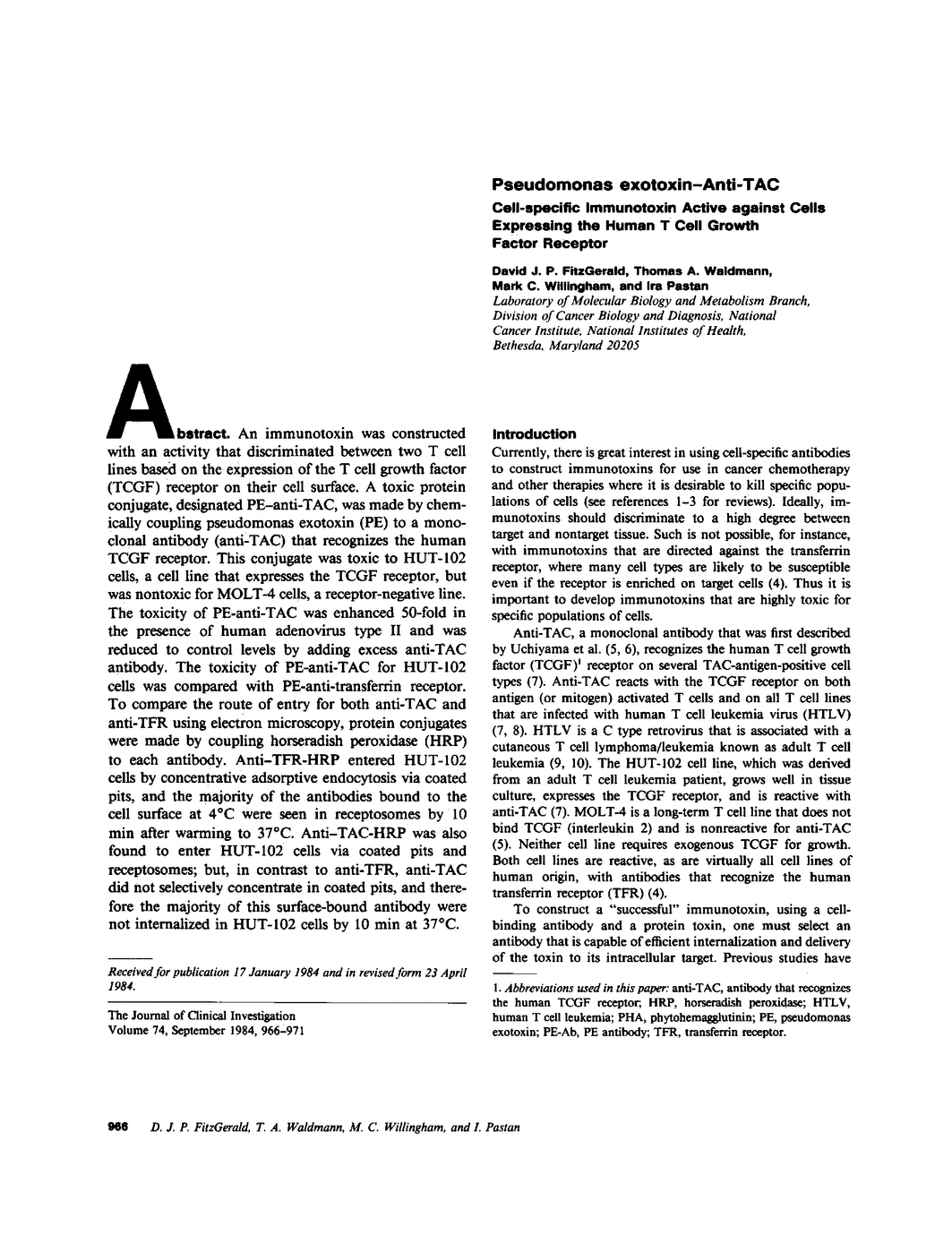 D J FitzGerald, T A Waldmann, M C Willingham, I Pastan
