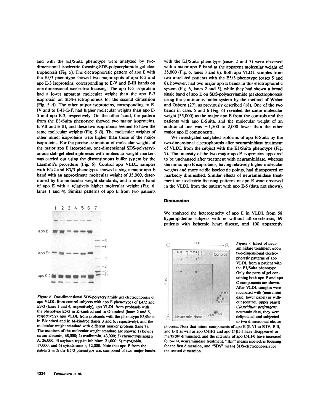 We analyzed the heterogeneity of apo E in very low density lipoprotein from 58 hyperlipidemic subjects with or without atherosclerosis, 69 patients with ischemic heart disease, and 100 apparently healthy individuals. Apo E gene frequencies in the group of healthy individuals were comparable with those in German and American populations. The distribution of six common apo E phenotypes in the groups of hyperlipidemia and ischemic heart disease was similar to that in the healthy group. In addition to the three major isoforms of apolipoprotein E (apo E-4, E-3, and E-2) and the new one (apo E-5) which was recently found in this laboratory, we have discovered an additional series of components, which showed themselves as at least three bands on an isoelectric focusing gel in the region of E-VII through E-V, in four patients with hyperlipidemia and atherosclerosis. The new series of apo E components, named apo E-Suita, was identical with the ordinary apo E in its interaction with heparin-Sepharose gel and with anti-apo E antibody. The most basic component of apo E-Suita (E-VII) was the unsialylated form and other components (E-VI and E-V), the sialylated forms. Family studies revealed that apo E-Suita was determined by inheritance of a new apo E allele located at the same locus as the hitherto known apo E components. Apo E-5 and apo E-Suita isoproteins had isoelectric points more basic than apo E-3, the parent type, by two and four units of charge, respectively. While the apo E-Suita isoprotein had the same molecular weight as ordinary major apo E isoproteins, the molecular weight of the apo E-5 isoprotein was approximately 1,500-2,000 lower than the other apo E isoproteins by sodium dodecyl sulfate-polyacrylamide gel electrophoresis. The incidence of abnormal apo E components, including apo E-5 and apo E-Suita, was high among patients with hyperlipidemia and ischemic heart disease (7:127), while we could not find such components among 100 healthy individuals. Moreover, five of seven patients with the abnormal apo E had overt atherosclerotic disease. The findings suggest that these kinds of apolipoprotein mutation are closely related to the development of atherosclerosis.