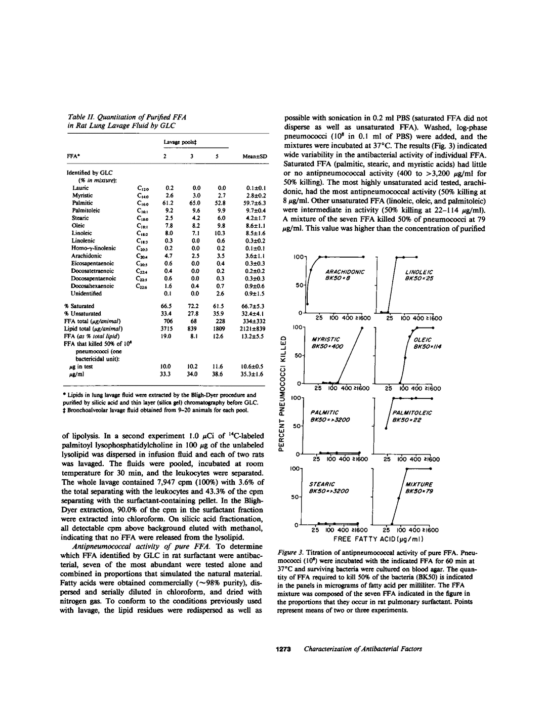 The surfactant fraction (55,000-g pellet) of leukocyte-free rat bronchoalveolar lavage fluid contains factors that rapidly kill and lyse pneumococci. These factors were purified and identified biochemically by using a quantitative bactericidal test to monitor fractionation procedures. 91% of the antipneumococcal activity of rat surfactant was recovered in chloroform after extraction of rat surfactant with chloroform-methanol (Bligh-Dyer procedure). After chromatography on silicic acid with chloroform, acetone, and methanol, all detectable antibacterial activity (approximately 80% of the initial activity) eluted with the neutral lipids in chloroform. When rechromatographed on silicic acid with hexane, hexane-chloroform, and chloroform, the antibacterial activity eluted with FFA. Thin-layer chromatography (TLC) established that the antibacterial activity was confined to the FFA fraction. Gas-liquid chromatography showed that the fatty acid fraction contained a mixture of long-chain FFA (C12 to C22) of which 66.7% were saturated and 32.4% were unsaturated. The quantity of TLC-purified FFA needed to kill 50% of 10(8) pneumococci under standardized conditions (one bactericidal unit) was 10.6 +/- 0.5 micrograms. Purified FFA acted as detergents, causing release of [3H]choline from pneumococcal cell walls and increased bacterial cell membrane permeability, evidenced by rapid unloading of 3-O-[3H]methyl-D-glucose. FFA acting as detergents appear to account for the bactericidal and bacteriolytic activity of rat pulmonary surfactant for pneumococci.