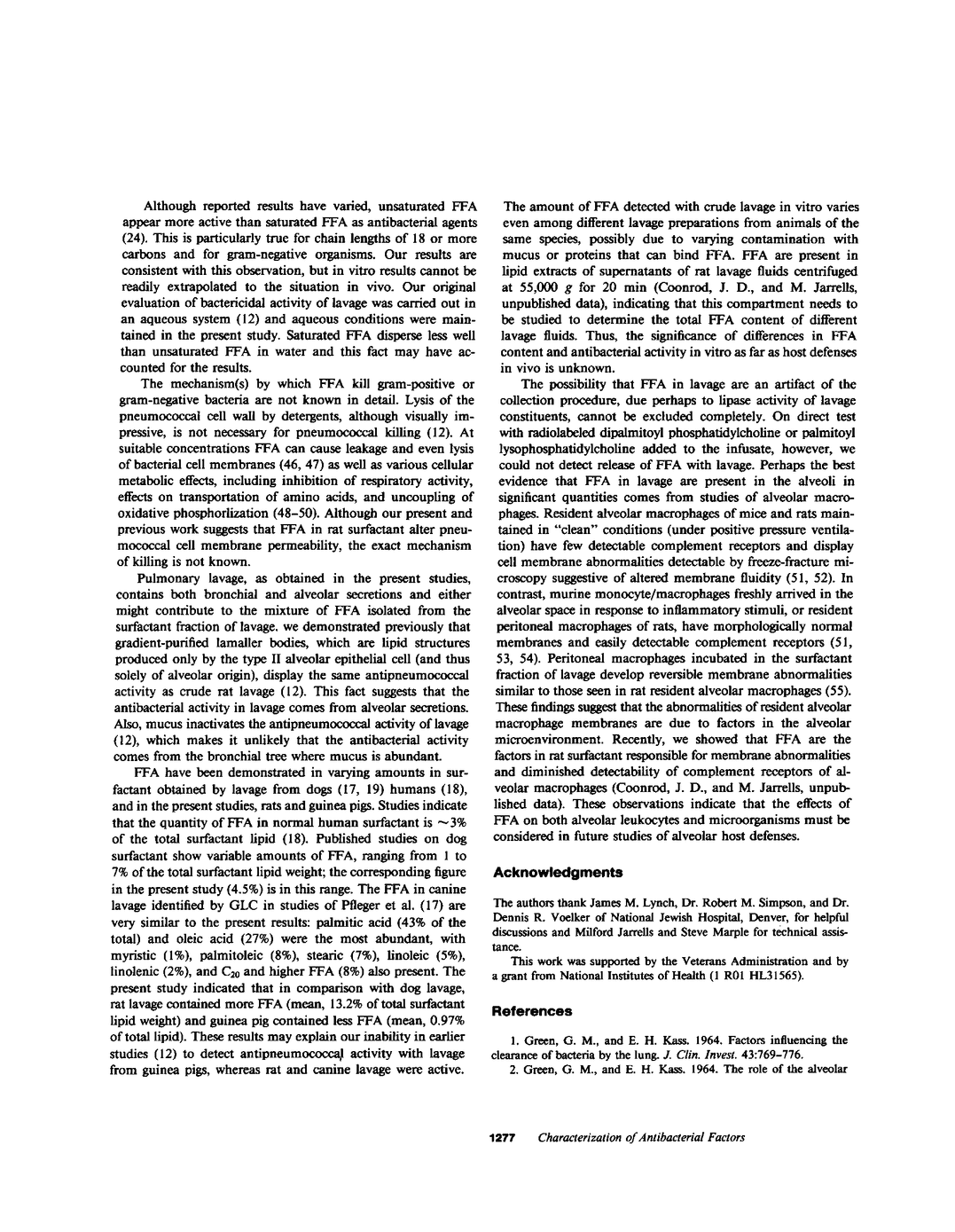 The surfactant fraction (55,000-g pellet) of leukocyte-free rat bronchoalveolar lavage fluid contains factors that rapidly kill and lyse pneumococci. These factors were purified and identified biochemically by using a quantitative bactericidal test to monitor fractionation procedures. 91% of the antipneumococcal activity of rat surfactant was recovered in chloroform after extraction of rat surfactant with chloroform-methanol (Bligh-Dyer procedure). After chromatography on silicic acid with chloroform, acetone, and methanol, all detectable antibacterial activity (approximately 80% of the initial activity) eluted with the neutral lipids in chloroform. When rechromatographed on silicic acid with hexane, hexane-chloroform, and chloroform, the antibacterial activity eluted with FFA. Thin-layer chromatography (TLC) established that the antibacterial activity was confined to the FFA fraction. Gas-liquid chromatography showed that the fatty acid fraction contained a mixture of long-chain FFA (C12 to C22) of which 66.7% were saturated and 32.4% were unsaturated. The quantity of TLC-purified FFA needed to kill 50% of 10(8) pneumococci under standardized conditions (one bactericidal unit) was 10.6 +/- 0.5 micrograms. Purified FFA acted as detergents, causing release of [3H]choline from pneumococcal cell walls and increased bacterial cell membrane permeability, evidenced by rapid unloading of 3-O-[3H]methyl-D-glucose. FFA acting as detergents appear to account for the bactericidal and bacteriolytic activity of rat pulmonary surfactant for pneumococci.