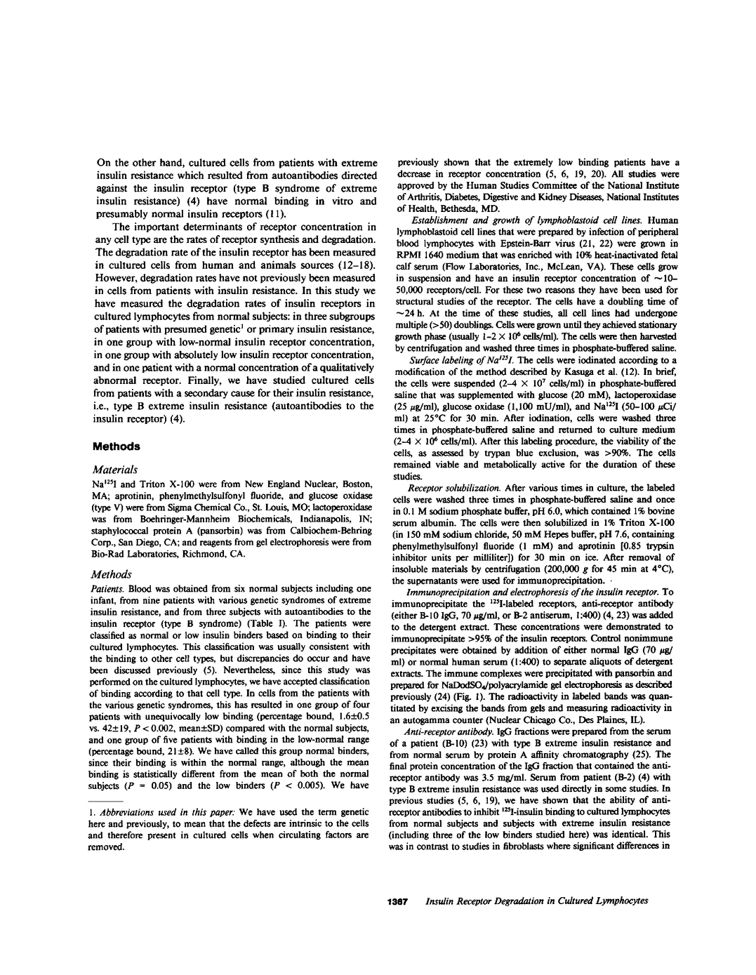 Previous studies of the insulin receptor in disease states have utilized primarily techniques of equilibrium binding and, to a limited extent structural, analysis. Though techniques have been developed to study receptor degradation in normal cells, they have not been applied to disease states. In the present study we have examined insulin receptor degradation rate in B lymphocytes that were obtained from peripheral blood of normal subjects and patients with several syndromes of extreme insulin resistance. B lymphocytes were established in culture from each patient's peripheral cells by transformation with Epstein-Barr virus. The insulin receptors were surface labeled using Na125I/lactoperoxidase and the cells were returned to incubate in growth media. After varying periods of incubation, aliquots of cells were solubilized and the cell content of labeled receptor subunits were measured by immunoprecipitation with anti-receptor antibodies and NaDodSO4/polyacrylamide gel electrophoresis. The fall in 125I-insulin receptor content approximated a single exponential and was quantitated as receptor subunit half-life (t1/2). In cell lines from four patients in whom the number of insulin receptors was reduced by greater than 90%, the rate of receptor loss was greater than normal (t1/2 equals 3.8 +/- 0.9 h vs. 6.5 +/- 1.2 h; mean +/- SD, P less than 0.01). However, a similar acceleration in receptor degradation was seen in cells from five patients with extreme insulin resistance but low-normal insulin receptor concentration (t1/2 equals 4.4 +/- 0.9 h). This group included cells from one patient with a qualitatively abnormal receptor. Thus, all the patients with genetic syndromes of insulin resistance had accelerated receptor degradation, regardless of their receptor concentration. By contrast, insulin receptors on cultured lymphocytes that were obtained from patients with extreme insulin resistance secondary to autoantibodies to the insulin receptor had normal receptor degradation (t1/2 equals 6.1 +/- 1.9 h). We conclude that (a) accelerated insulin receptor degradation is an additional feature of cells from patients with genetic forms of insulin resistance; (b) that accelerated insulin receptor degradation may explain the low-normal receptor concentrations that were seen in some patients with extreme insulin resistance; and (c) that accelerated degradation does not explain the decreased receptor concentration in patients with very low insulin receptor binding and, therefore, by inference, a defect in receptor synthesis must be present in this subgroup.