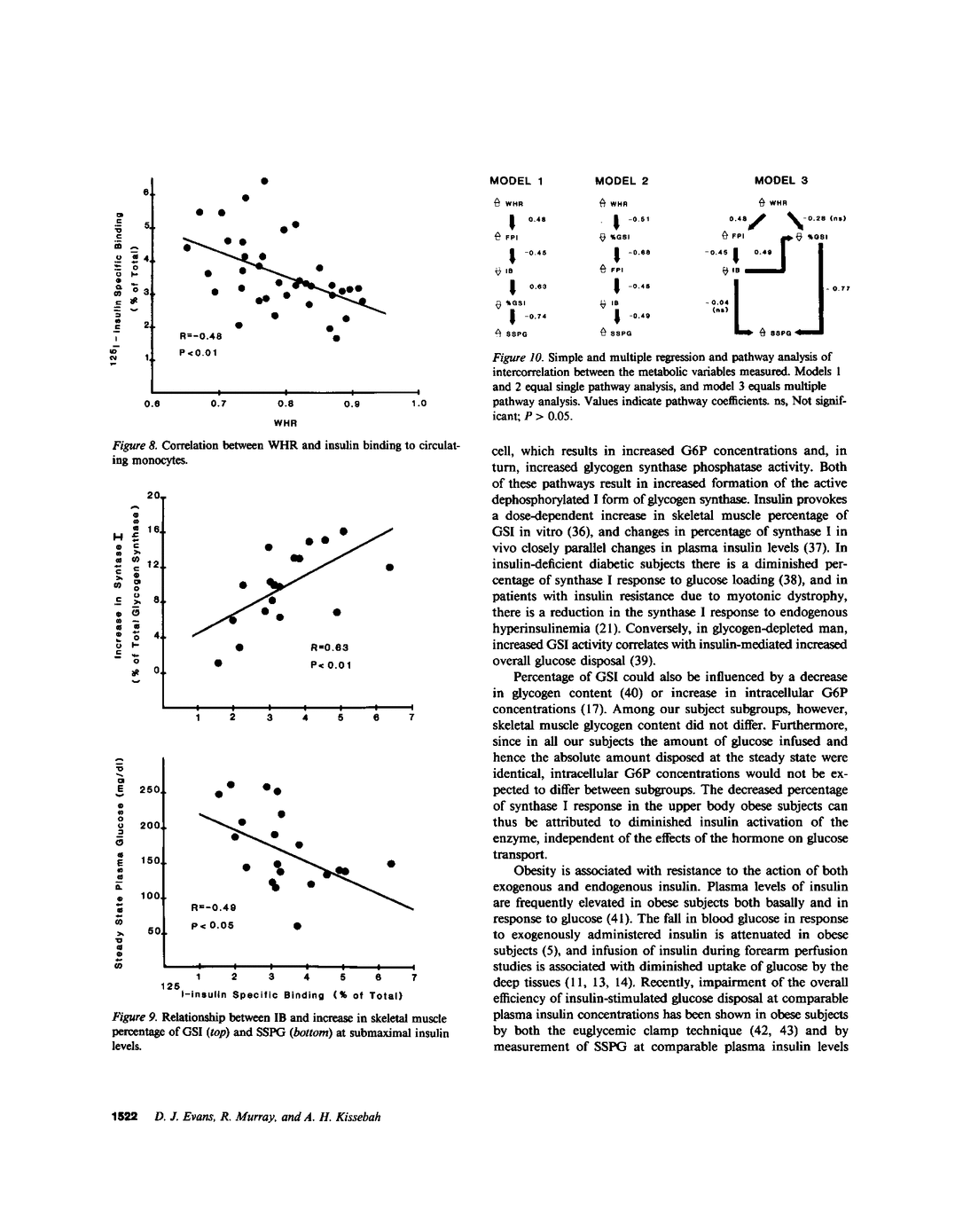 Skeletal muscle sensitivity and responsiveness to insulin and their relationship to overall glucose disposal and insulin binding were determined in 89 premenopausal women of varying body fat topography (waist/hips girth ratio [WHR] 0.64-1.02) and obesity level (percentage of ideal body weight 92-230). As a marker of insulin action, the percentage of total glycogen synthase present in the I form (glucose-6-phosphate independent) was measured in quadriceps muscle biopsies. The increase in percentage of synthase I 1 h after oral glucose loading was not significantly different between nonobese and obese weight-matched subgroups of increasing WHR, but this response was maintained at the expense of increasing plasma insulin levels as the WHR rose. The increase in percentage of synthase I in response to submaximal steady state plasma insulin (SSPI) of approximately 100 microU/ml achieved by the infusion of somatostatin, insulin, and glucose, however, was significantly lower in obese than in nonobese subjects, and was inversely correlated with WHR. The increase in percentage of synthase I correlated inversely with the steady state plasma glucose (SSPG) concentration, which is an index of the efficiency of overall glucose disposal, and directly with insulin binding to circulating monocytes. Insulin binding also correlated inversely with WHR and with fasting plasma insulin levels. When obese subjects were separated into three weight-matched subgroups on the basis of increasing WHR, significant trends to decreased percentage of synthase I response, increased SSPG, and decreased insulin binding were found. In women with predominantly upper body obesity (WHR greater than 0.85), the increase in percentage of synthase in response to submaximal SSPI was diminished, but there was no impairment of percentage of synthase I responsiveness to supramaximal SSPI of approximately 1,000 microU/ml. At supramaximal SSPI levels, SSPG in four obese women was normal, whereas in five women, SSPG concentrations were markedly increased. Our results suggest that in premenopausal women, impaired skeletal muscle insulin sensitivity that results in decreased glucose storage capacity may contribute to the diminished efficiency of glucose disposal and insulin resistance that are associated with upper body obesity. The impairment in skeletal muscle sensitivity may be overcome in vivo at the expense of increasing plasma insulin levels, with maximal responsiveness remaining unimpaired. This defect may result from a reduction in insulin receptor number which could, in turn, be secondary to persistently elevated fasting plasma insulin levels. In some upper body segment obese women, however, an additional defect affecting other insulin-sensitive pathways may also be present.