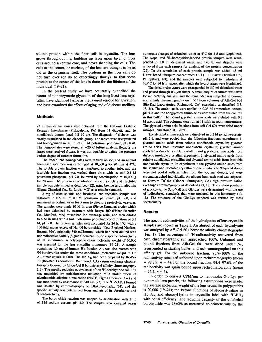 We have examined the nonenzymatic glycation of human lens crystallin, an extremely long-lived protein, from 16 normal human ocular lenses 0.2-99 yr of age, and from 11 diabetic lenses 52-82-yr-old. The glucitol-lysine (Glc-Lys) content of soluble and insoluble crystallin was determined after reduction with H-borohydride followed by acid hydrolysis, boronic acid affinity chromatography, and high pressure cation exchange chromatography. Normal lens crystallin, soluble and insoluble, had 0.028 +/- 0.011 nanomoles Glc-Lys per nanomole crystallin monomer. Soluble and insoluble crystallins had equivalent levels of glycation. The content of Glc-Lys in normal lens crystallin increased with age in a linear fashion. Thus, the nonenzymatic glycation of nondiabetic lens crystallin may be regarded as a biological clock. The diabetic lens crystallin samples (n = 11) had a higher content of Glc-Lys (0.070 +/- 0.034 nmol/nmol monomer). Over an age range comparable to that of the control samples, the diabetic crystallin samples contained about twice as much Glc-Lys. The Glc-Lys content of the diabetic lens crystallin samples did not increase with lens age.
