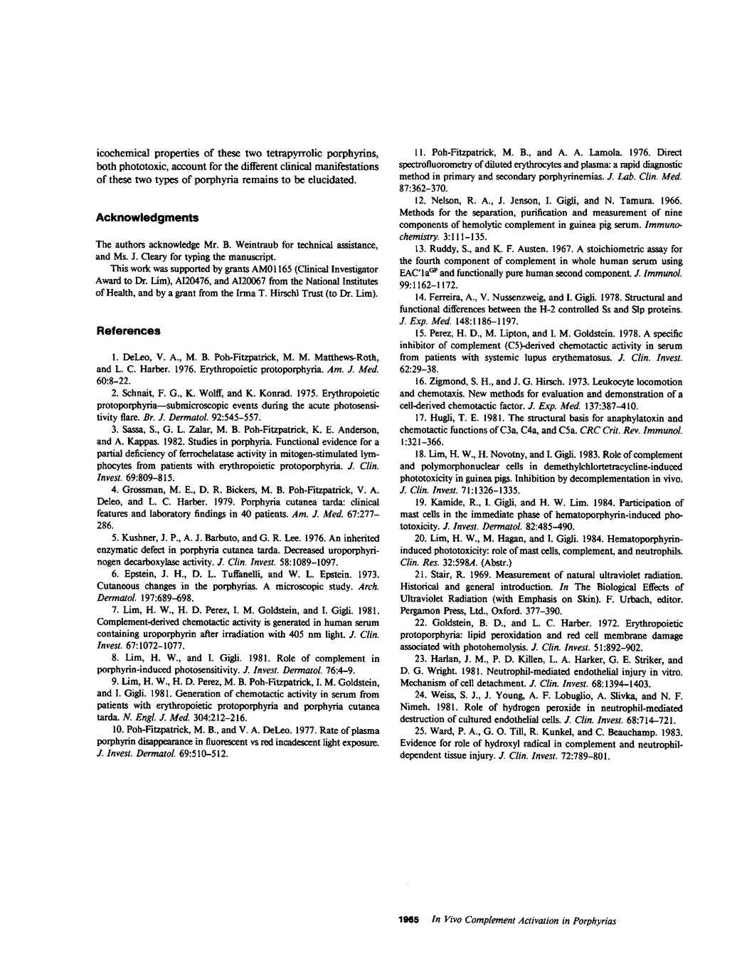 Irradiation of the forearms of two patients with erythropoietic protoporphyria and one patient with porphyria cutanea tarda resulted in an in vivo activation of the complement system, as assessed by diminution of the hemolytic titers of the third component of complement by 23-57%, and of the fifth component of complement (C5) by 19-47%. Such treatment also generated chemotactic activity for human polymorphonuclear cells; the chemotactic activity was stable at 56 degrees C and antigenically related to human C5. On Sephadex G-75 chromatography the chemotactic activity eluted with an apparent molecular weight of 15,000. These in vivo results extend our previous in vitro observation of photoactivation of complement in sera from patients with erythropoietic protoporphyria and porphyria cutanea tarda, and suggest that the complement system may participate in the pathogenesis of cutaneous phototoxicity in these patients.
