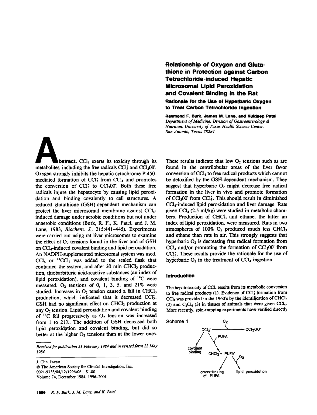 CCl4 exerts its toxicity through its metabolites, including the free radicals CCl3. and CCl(3)00.. Oxygen strongly inhibits the hepatic cytochrome P-450-mediated formation of CCl3. from CCl4 and promotes the conversion of CCl3. to CCl(3)00.. Both these free radicals injure the hepatocyte by causing lipid peroxidation and binding covalently to cell structures. A reduced glutathione (GSH)-dependent mechanism can protect the liver microsomal membrane against CCl4-induced damage under aerobic conditions but not under anaerobic conditions (Burk, R.F., K. Patel, and J.M. Lane, 1983, Biochem. J., 215:441-445). Experiments were carried out using rat liver microsomes to examine the effect of O2 tensions found in the liver and of GSH on CCl4-induced covalent binding and lipid peroxidation. An NADPH-supplemented microsomal system was used. CCl4 or 14CCl4 was added to the sealed flask that contained the system, and after 20 min CHCl3 production, thiobarbituric acid-reactive substances (an index of lipid peroxidation), and covalent binding of 14C were measured. O2 tensions of 0, 1, 3, 5, and 21% were studied. Increases in O2 tension caused a fall in CHCl3 production, which indicated that it decreased CCl3.. GSH had no significant effect on CHCl3 production at any O2 tension. Lipid peroxidation and covalent binding of 14C fell progressively as O2 tension was increased from 1 to 21%. The addition of GSH decreased both lipid peroxidation and covalent binding, but did so better at the higher O2 tensions than at the lower ones. These results indicate that low O2 tensions such as are found in the centrilobular areas of the liver favor conversion of CCl4 to free radical products which cannot be detoxified by the GSH-dependent mechanism. They suggest that hyperbaric O2 might decrease free radical formation in the liver in vivo and promote formation of CCl(3)00. from CCl3.. This should result in diminished CCl4-induced lipid peroxidation and liver damage. Rats given CCl4 (2.5 ml/kg) were studied in metabolic chambers. Production of CHCl3 and ethane, the latter an index of lipid peroxidation, were measured. Rats in two atmospheres of 100% O2 produced much less CHCl3 and ethane than rats in air. This strongly suggests that hyperbaric O2 is decreasing free radical formation from CCl4 and/or promoting the formation of CCl(3)00. from CCl3.. These results provide the rationale for the use of hyperbaric O2 in the treatment of CCl4 ingestion.