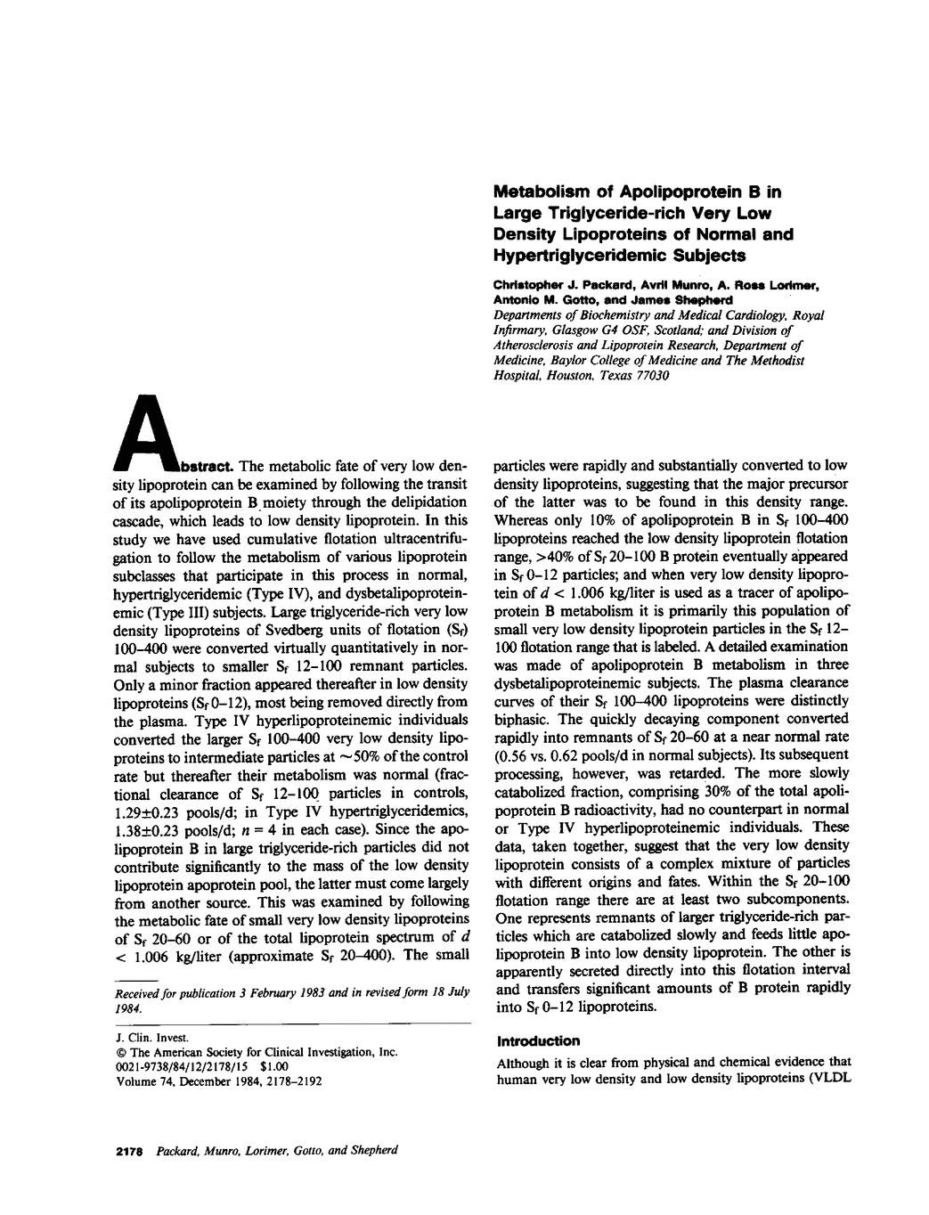 C J Packard, A Munro, A R Lorimer, A M Gotto, J Shepherd