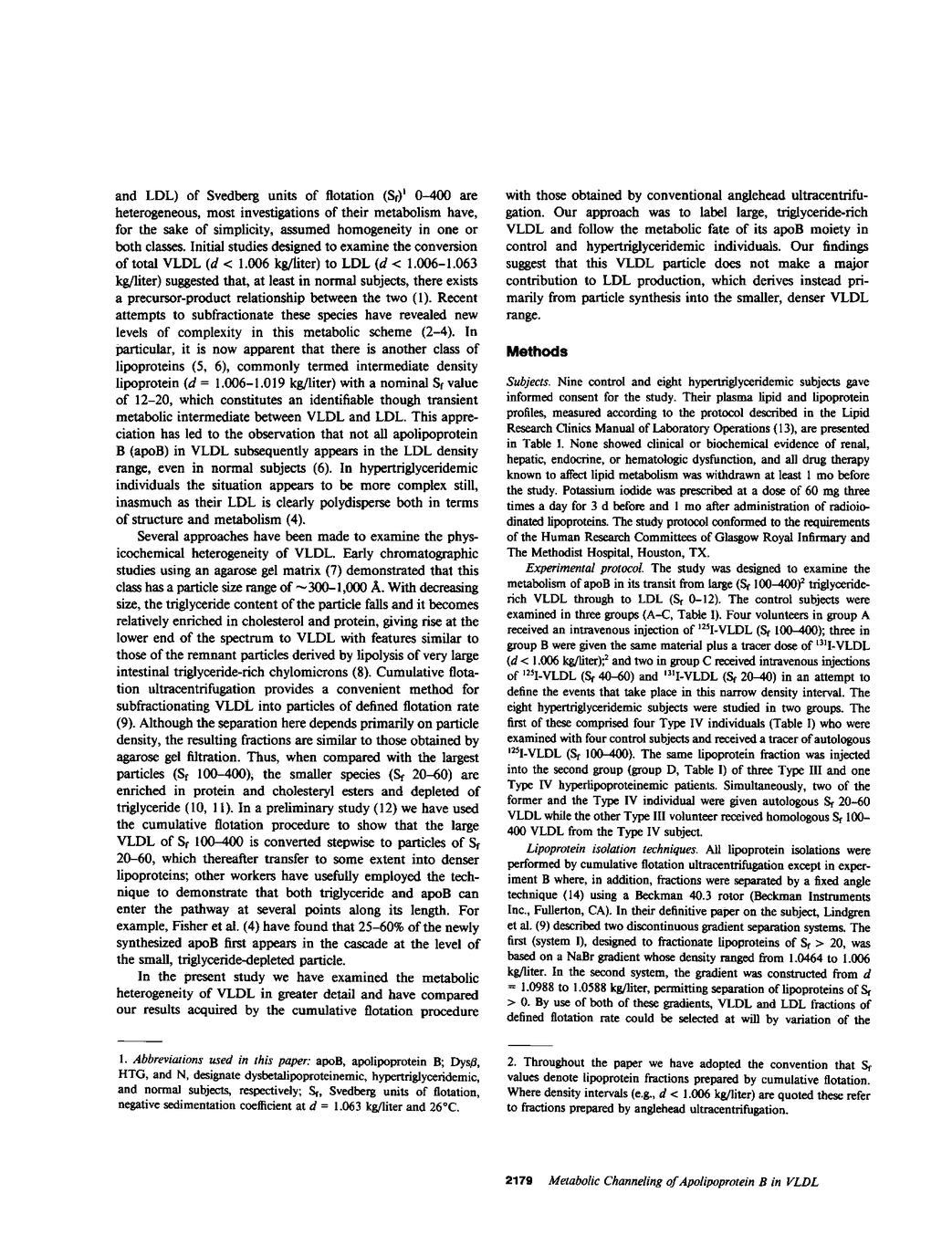 The metabolic fate of very low density lipoprotein can be examined by following the transit of its apolipoprotein B moiety through the delipidation cascade, which leads to low density lipoprotein. In this study we have used cumulative flotation ultracentrifugation to follow the metabolism of various lipoprotein subclasses that participate in this process in normal, hypertriglyceridemic (Type IV), and dysbetalipoproteinemic (Type III) subjects. Large triglyceride-rich very low density lipoproteins of Svedberg units of flotation (Sf) 100-400 were converted virtually quantitatively in normal subjects to smaller Sf 12-100 remnant particles. Only a minor fraction appeared thereafter in low density lipoproteins (Sf 0-12), most being removed directly from the plasma. Type IV hyperlipoproteinemic individuals converted the larger Sf 100-400 very low density lipoproteins to intermediate particles at approximately 50% of the control rate but thereafter their metabolism was normal (fractional clearance of Sf 12-100 particles in controls, 1.29 +/- 0.23 pools/d; in Type IV hypertriglyceridemics, 1.38 +/- 0.23 pools/d; n = 4 in each case). Since the apolipoprotein B in large triglyceride-rich particles did not contribute significantly to the mass of the low density lipoprotein apoprotein pool, the latter must come largely from another source. This was examined by following the metabolic fate of small very low density lipoproteins of Sf 20-60 or of the total lipoprotein spectrum of d less than 1.006 kg/liter (approximate Sf 20-400). The small particles were rapidly and substantially converted to low density lipoproteins, suggesting that the major precursor of the latter was to be found in this density range. Whereas only 10% of apolipoprotein B in Sf 100-400 lipoproteins reached the low density lipoprotein flotation range, greater than 40% of Sf 20-100 B protein eventually appeared in Sf 0-12 particles; and when very low density lipoprotein of d less than 1.006 kg/liter is used as a tracer of apolipoprotein B metabolism it is primarily this population of small very low density lipoprotein particles in the Sf 12-100 flotation range that is labeled. A detailed examination was made of apolipoprotein B metabolism in three dysbetalipoproteinemic subjects. The plasma clearance curves of their Sf 100-400 lipoproteins were distinctly biphasic. The quickly decaying component converted rapidly into remnants of Sf 20-60 at a near normal rate (0.56 vs. 0.62 pools/d in normal subjects). Its subsequent processing, however, was retarded. The more slowly catabolized fraction, comprising 30% of the total apolipoprotein B radioactivity, had no counterpart in normal or Type IV hyperlipoproteinemic individuals. These data, taken together, suggest that the very low density lipoprotein consists of a complex mixture of particles with different origins and fates. Within the Sf 20-100 flotation range there are at least two subcomponents. One represents remnants of larger triglyceride-rich particles which are catabolized slowly and feeds little apolipoprotein B into low density lipoprotein. The other is apparently secreted directly into this flotation interval and transfers significant amounts of B protein rapidly into Sf 0-12 lipoproteins.
